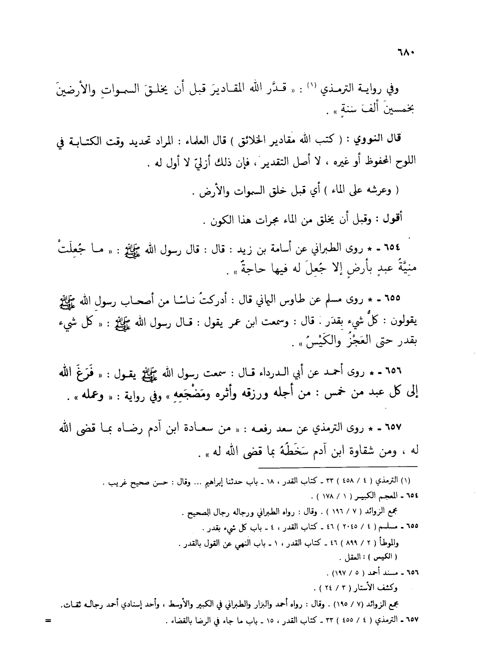 وفي رواية الترمذي (1): "قدَّر الله المقادير قبل أن يخلق السموات والأرضين بخمسين ألف سنةٍ".