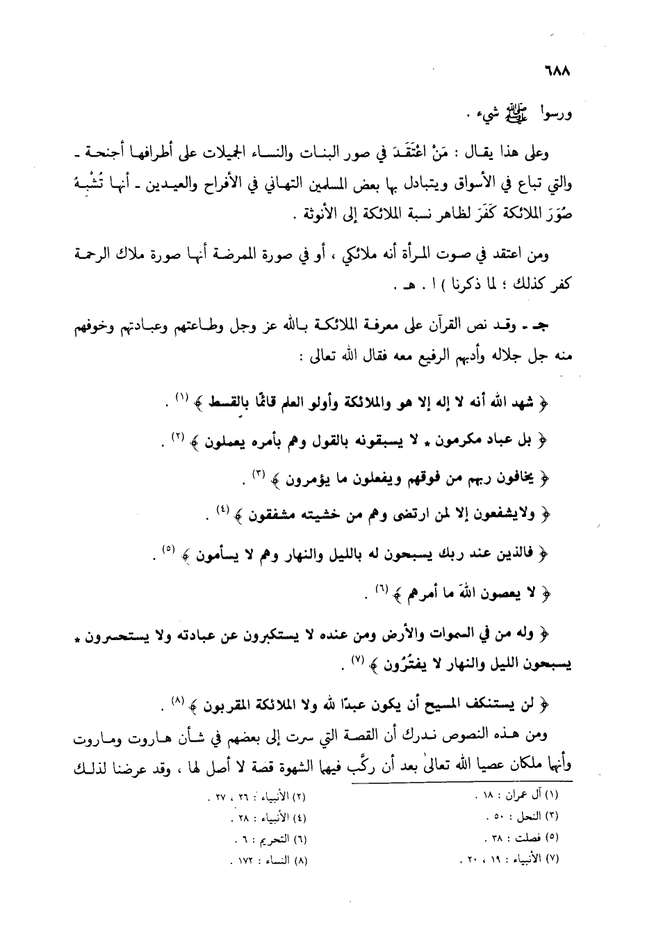 وعلى هذا يقال: من اعتقد في صور البنات والنساء الجميلات على أطرافها أجنحة- والتي تباع في الأسواق ويتبادل بها بعض المسلمين التهاني في الأفراح والعيدين- أنها تشبه صور الملائكة كفر لظاهر نسبة الملائكة إلى الأنوثة.