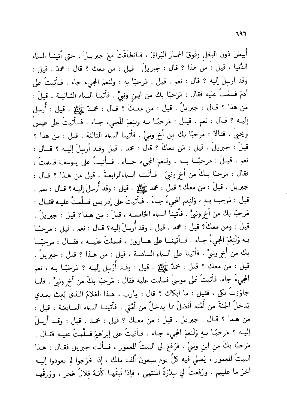 أبيض دون البغل وفوق الحمار البُراق، فانطلقت مع جبريل، حتى أتينا السماء الدنيا، قيل: من هذا؟ قال: جبريل. قيل: من معك؟ قال: محمد. قيل: وقد أرسل إليه؟ قال: نعم. قيل: مرحباً به؛ ولنعم المجيء جاء. فأتيت على آدم فسلمت عليه فقال: مرحباً بك من ابنٍ ونبيٍّ. فأتينا السماء الثانية، قيل: من هذا؟ قال: جبريل. قيل: من معك؟ قال: محمد صلى الله عليه وسلم. قيل: أُرسِل إليه؟ قال: نعم. قيل: مرحباً به ولنعم المجيء جاء. فأتيت على عيسى ويحيى، فقالا: مرحباً بك من أخٍ ونبيٍّ. فأتينا السماء الثالثة. قيل: من هذا؟ قيل: جبريل. قيل: من معك؟ قال: محمد. قيل وقد أرسِل إليه؟ قال: نعم. قيل: مرحباً به، ولنعم المجيء جاء. فأتيت على يوسف فسلمت، فقال: مرحباً بك من أخٍ ونبيٍّ. فأتينا السماء الرابعة، قيل من هذا؟ قال: جبريل. قيل: من معك؟ قيل: محمد صلى الله عليه وسلم. قيل: وقد أرسِل إليه؟ قال: نعم. قيل: مرحباً به، ولنعم المجيء جاء. فأتيت على إدريس فسلمت عليه فقال: مرحباً بك من أخٍ ونبيٍّ. فأتينا السماء الخامسة، قيل: من هذا؟ قيل: جبريل. قيل: ومن معك؟ قيل: محمد. قيل: وقد أرسل إليه؟ قال: نعم. قيل: مرحباً به ولنعم المجيء جاء. فأتينا على هارون، فسملت عليه، فقال: مرحباً بك من أخٍ ونبيٍّ. فأتينا على السماء السادسة، قيل: من هذا؟ قيل: جبريل. قيل: من معك؟ قيل: محمد صلى الله عليه وسلم. قيل: وقد أرسل إليه؟ مرحباً به، نعم المجيء جاء. فأتيت على موسى فسلمت عليه فقال: مرحباً بك من أخٍ ونبيٍّ. فلما جاوزت بكى، فقيل: ما أبكاك؟ قال: يا رب، هذا الغلام الذى بُعث بعدي يدخل الجنة من أمته أفضل مما يدخل من أمتي. فأتينا السماء السابعة، قيل: من هذا؟ قال: جبريل. قيل: من معك؟ قيل: محمد. قيل: وقد أرسل إليه؟ مرحباً به ولنعم المجيء جاء. فأتيت على إبراهيم فسلمت عليه فقال: مرحباً بك من ابنٍ ونبيٍّ. فرُفع لي البيت المعمور، فسألت جبريل فقال: هذا البيت المعمور، يُصلي فيه كل يوم سبعون ألف ملك، إذا خرجوا لم يعودوا إليه آخر ما عليهم. ورُفعت لي سدرةُ المنتهى، فإذا نَبِقُها كأنه قِلال هجر، وورقها
