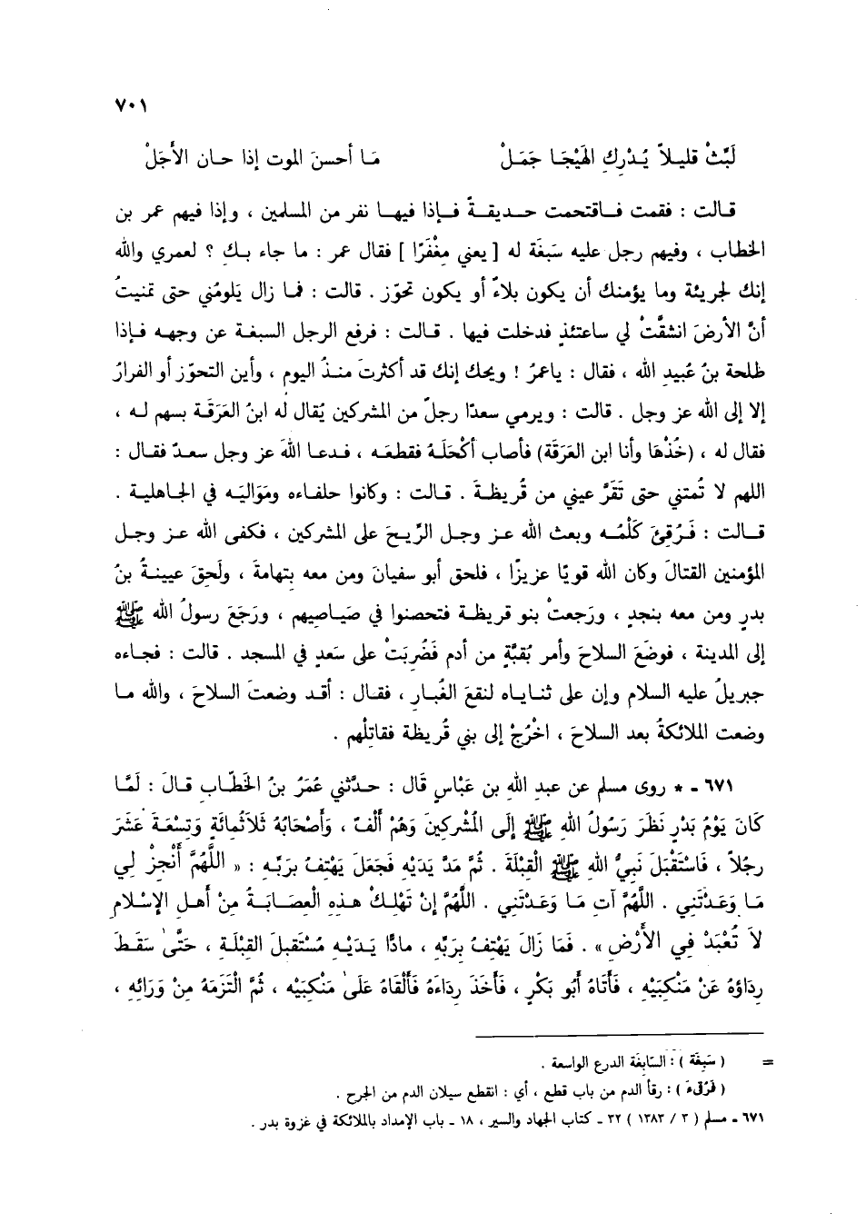 671 - * روى مسلم عن عبد الله بن عباسٍ قال: حدثني عمر بن الخطاب قال: لما كان يوم بدر نظر رسول الله صلى الله عليه وسلم إلى المشركين وهم ألفٌ، وأصحابه ثلاثمائة وتسعة عشر رجلاً، فاستقبل نبي الله صلى الله عليه وسلم القبلة. ثم مد يديه فجعل يهتف بربه: "اللهم أنجز لي ما وعدتني. اللهم آتِ ما وعدتني. اللهم إن تهلك هذه العصابة من أهل الإسلام لا تعبد في الأرض". فما زال يهتف بربه، ماداً يديه مستقبل القبلة، حتى سقط رداؤه عن منكبيه، فأتاه أبو بكر، فأخذ رداءه فألقاه على منكبيه، تم التزمه من ورائه،