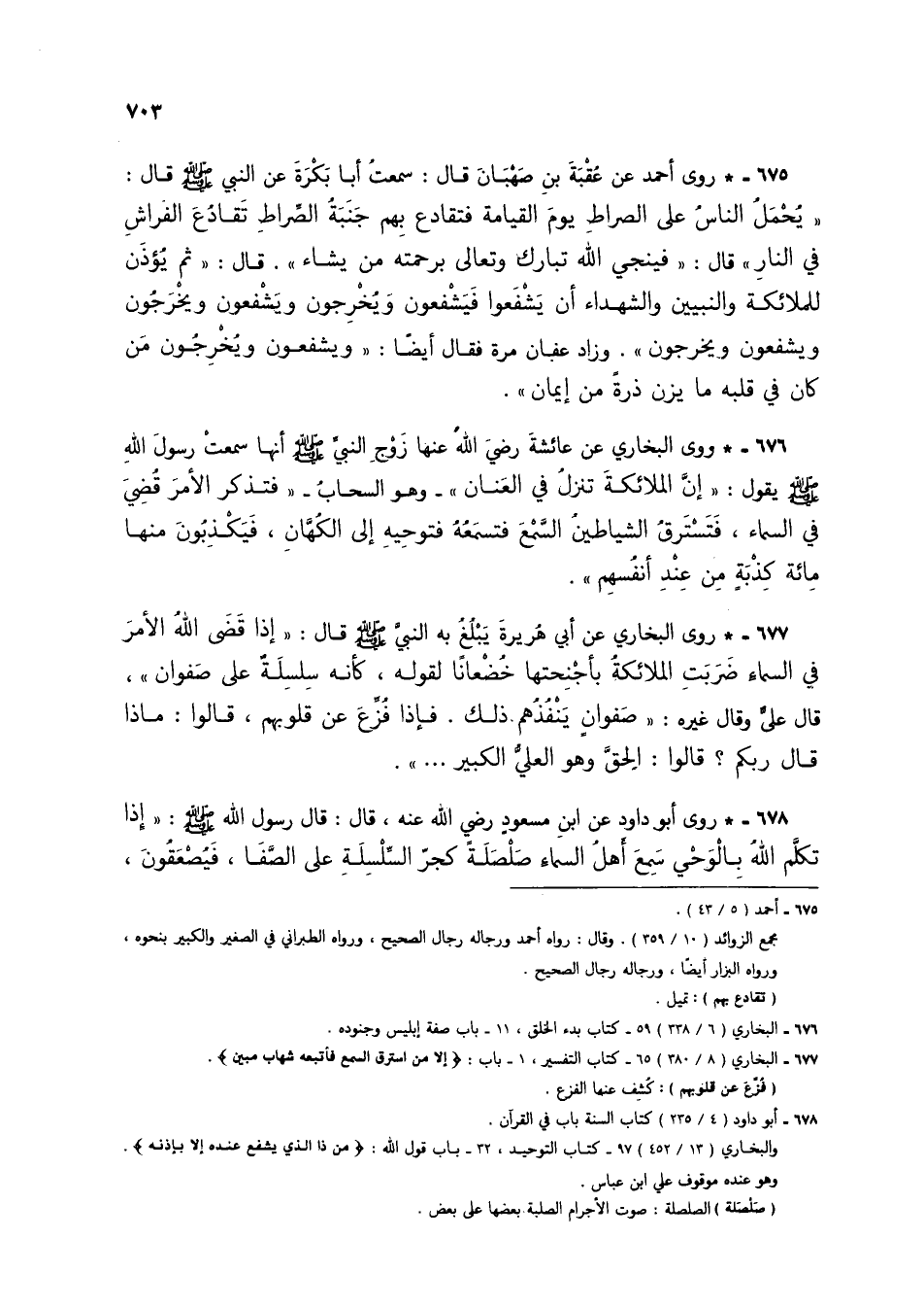677 - * روى البخاري عن أبي هريرة يبلغ به النبي صلى الله عليه وسلم قال: "إذا قضى الله الأمر في السماء ضربت الملائكة بأجنحتها خُضعاناً لقوله، كأنه سلسلةٌ على صفوان"، قال عليٌ وقال غيره: "صفوانٍ ينفذهم ذلك. فإذا فُزع عن قلوبهم، قالوا: ماذا قال ربك؟ قالوا: الحق وهو العلي الكبير .... ".