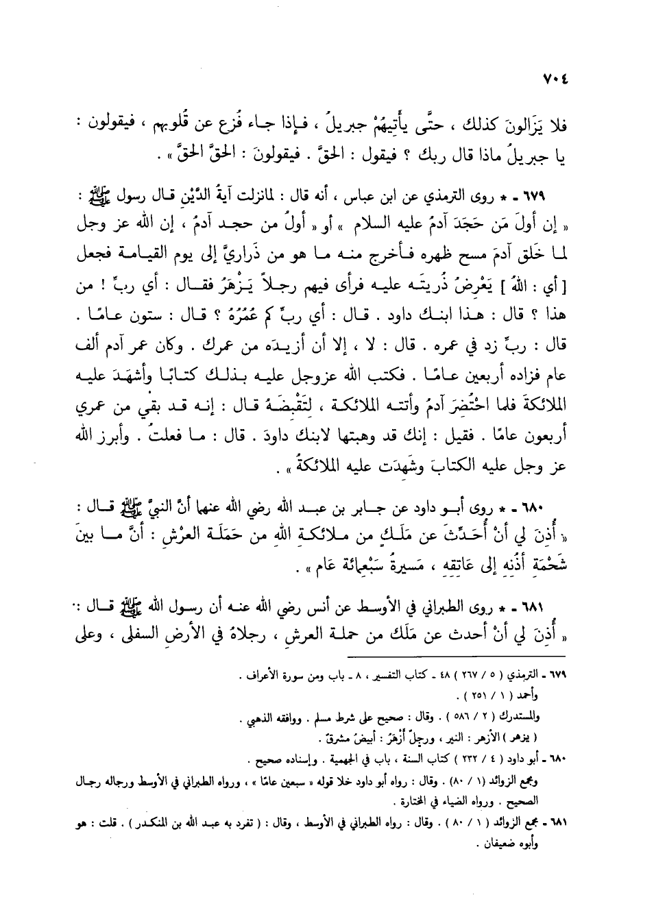 681 - * روى الطبراني في الأوسط عن أنس رضي الله عنه أن رسول الله صلى الله عليه وسلم قال: "أُذن لي أن أحدث عن ملك من حملة العرش، رجلاه في الأرض السفلى، وعلى