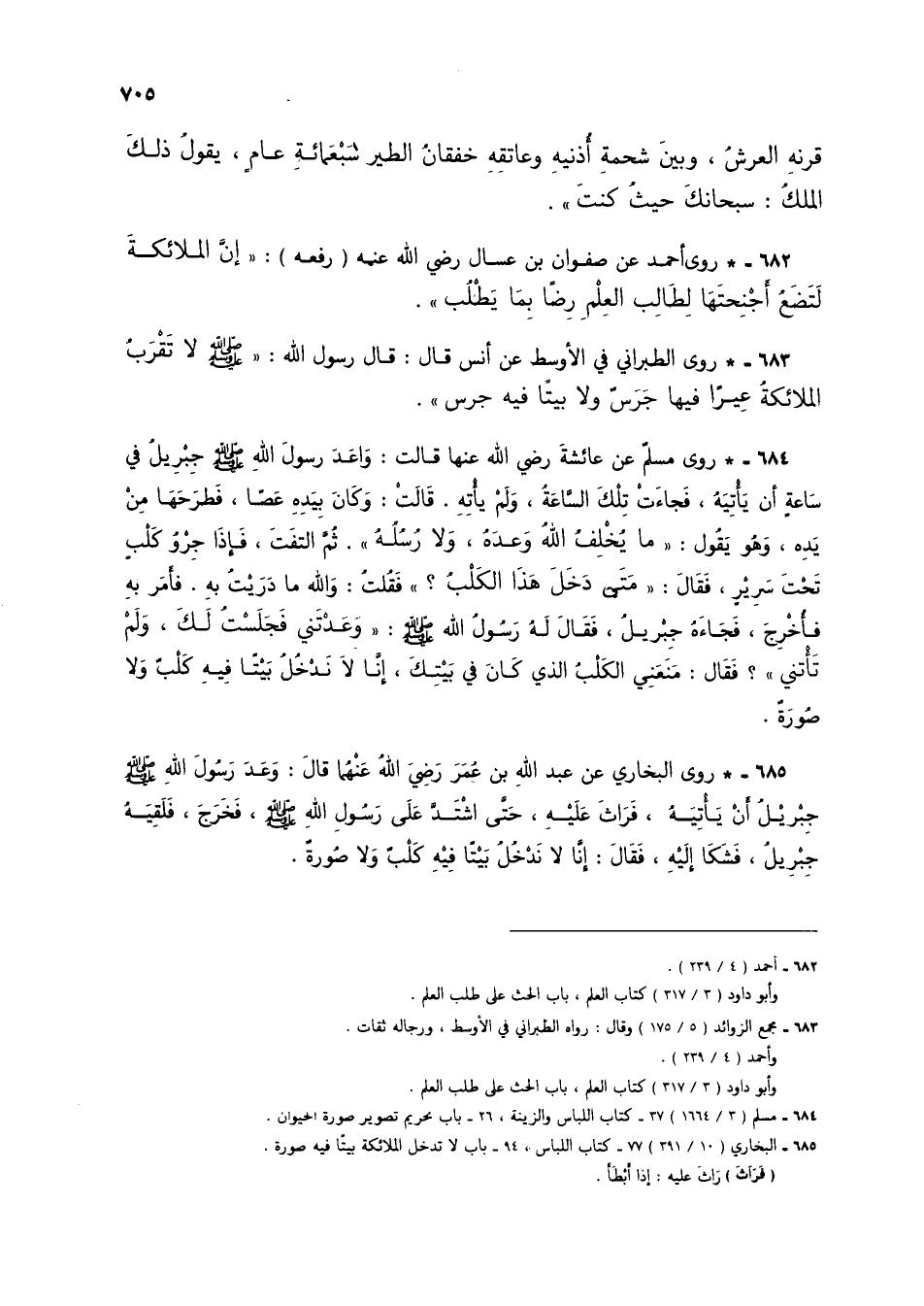 685 - * روى البخاري عن عبد الله بن عمر رضي الله عنهما قال: وعد رسول الله صلى الله عليه وسلم جبريل أن يأتيه، فراث عليه، حتى اشتد على رسول الله صلى الله عليه وسلم، فخرج، فلقيه جبريل، فشكا إليه، فقال: إنا لا تدخل بيتاً فيه كلبٌ ولا صورةٌ.