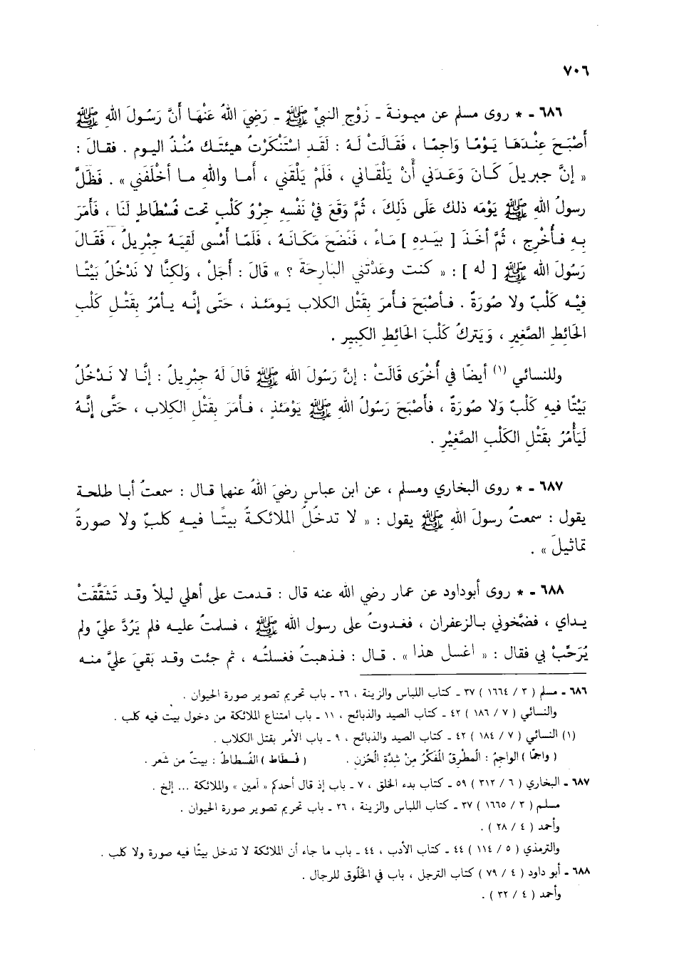 686 - * روى مسلم عن ميمونة- زوج النبي صلى الله عليه وسلم- رضي الله عنها أن رسول الله صلى الله عليه وسلم أصبح عندها يوماً واجماً؛ فقالت له: لقد استنكرت هيئتك منذ اليوم. فقال: "إن جبريل كان وعدني أن يلقاني، فلم يلقني، أما والله ما أخلفني". فظل رسول الله صلى الله عليه وسلم يومه ذلك على ذلك، ثم وقع في نفسه جرو كلبٍ تحت فُسطاطٍ لنا، فأمر به فأخرج، ثم أخذ [بيده] ماءً، فنضح مكانه، فلما أمسى لقيه جبريل، فقال رسول الله صلى الله عليه وسلم [له]: "كنت وعدتني البارحة؟ " قال: أجل، ولكنا لا تدخل بيتا فيه كلب ولا صورة. فأصبح فأمر بقتل الكلاب يومئذ، حتى إنه يأمر بقتل كلب الحائط الصغير، ويترك كلب الحائط الكبير.
