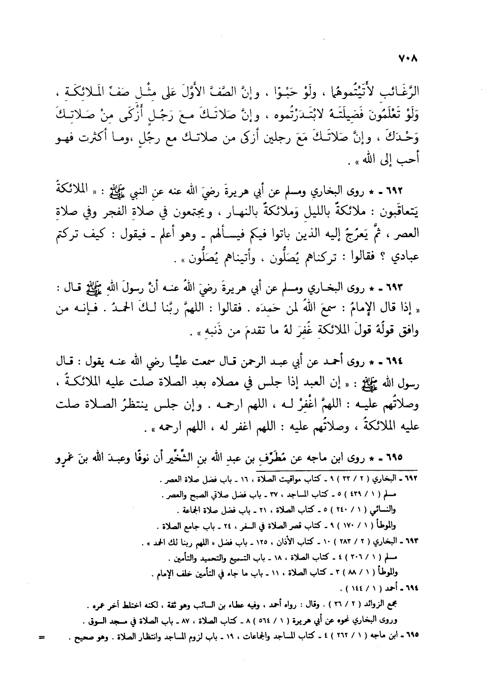 694 - * روى أحمد عن أبي عبد الرحمن قال سمعت علياً رضى الله عنه يقول: قال رسول الله صلى الله عليه وسلم: "إن العبد إذا جلس في مصلاه بعد الصلاة صلت عليه الملائكة، وصلاتهم عليه: اللهم اغفر له، اللهم ارحمه. وإن جلس ينتظرُ الصلاة صلت عليه الملائكة، وصلاتهم عليه: اللهم اغفر له، اللهم ارحمه".