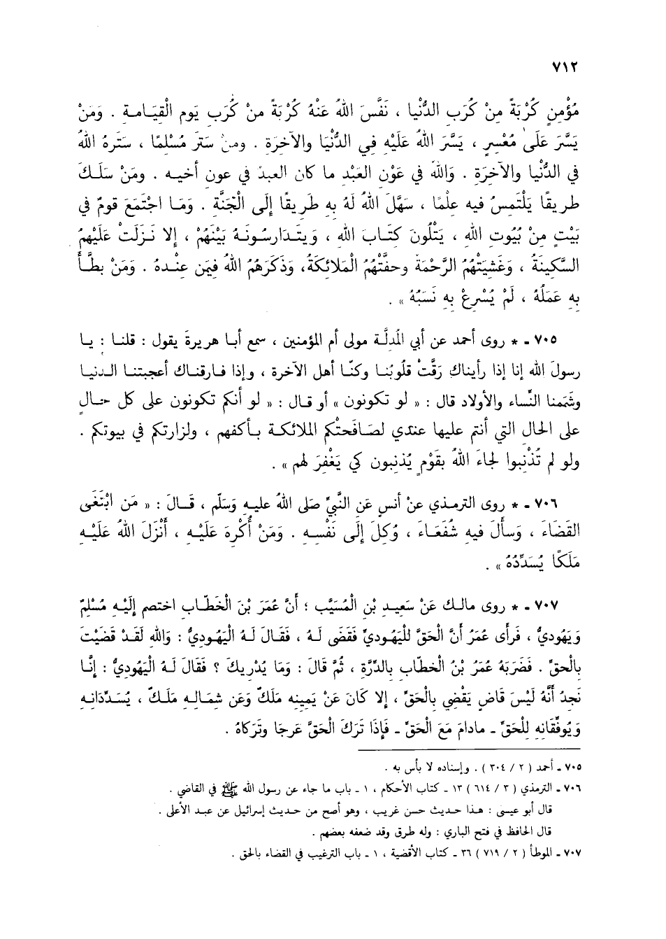 706 - * روى الترمذي عن أنسٍ عن النبي صلى الله عليه وسلم، قال: "من ابتغى القضاء، وسأل فيه شفعاء، وكل إلى نفسه. ومن أكره عليه، أنزل الله عليه ملكاً يسدده".