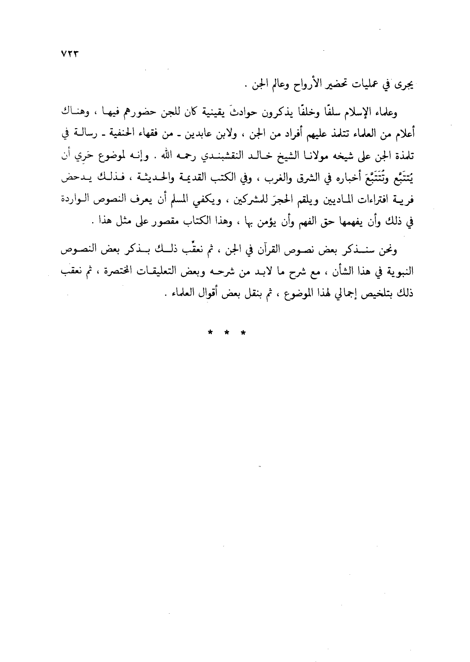 وعلماء الإسلام سلفًا وخلفًا يذكرون حوادث يقينية كان للجن حضورهم فيها، وهناك أعلام من العلماء تتلمذ عليهم أفراد من الجن، ولابن عابدين -من فقهاء الحنفية- رسالة في تلمذة الجن على شيخه مولانا الشيخ خالد النقشبندي رحمه الله. وإنه لموضوع حري أن يتتبع وتتبع أخباره في الشرق والغرب، وفي الكتب القديمة والحديثة، فذلك يدحض فرية افتراءات الماديين ويلقم الحجر للمشركين، ويكفي المسلم أن يعرف النصوص الواردة في ذلك أن يفهمها حق الفهم وأن يؤمن بها، وهذا الكتاب مقصور على مثل هذا.