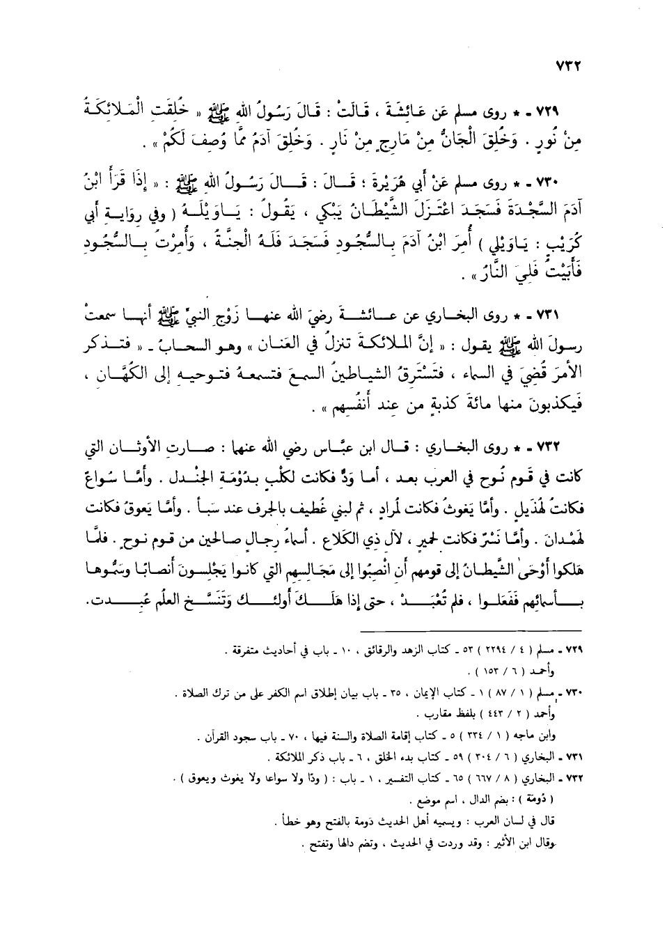 729 - * روى مسلم عن عائشة، قالت: قال رسول الله صلى الله عليه وسلم "خلقت الملائكة من نورٍ. وخلق الجان من مارجٍ من نارٍ. وخلق آدم مما وصف لكم".