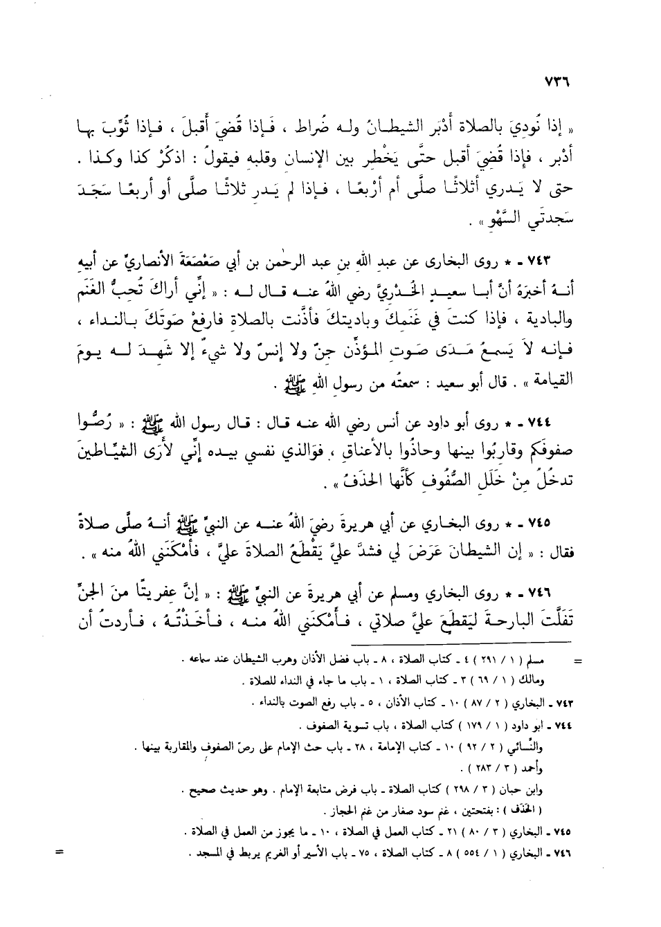 745 - * روى البخاري عن أبي هريرة رضي الله عنه عن النبي صلى الله عليه وسلم أنه صلى صلاة فقال: "إن الشيطان عرض لي فشد علي يقطع الصلاة علي، فأمكنني الله منه".