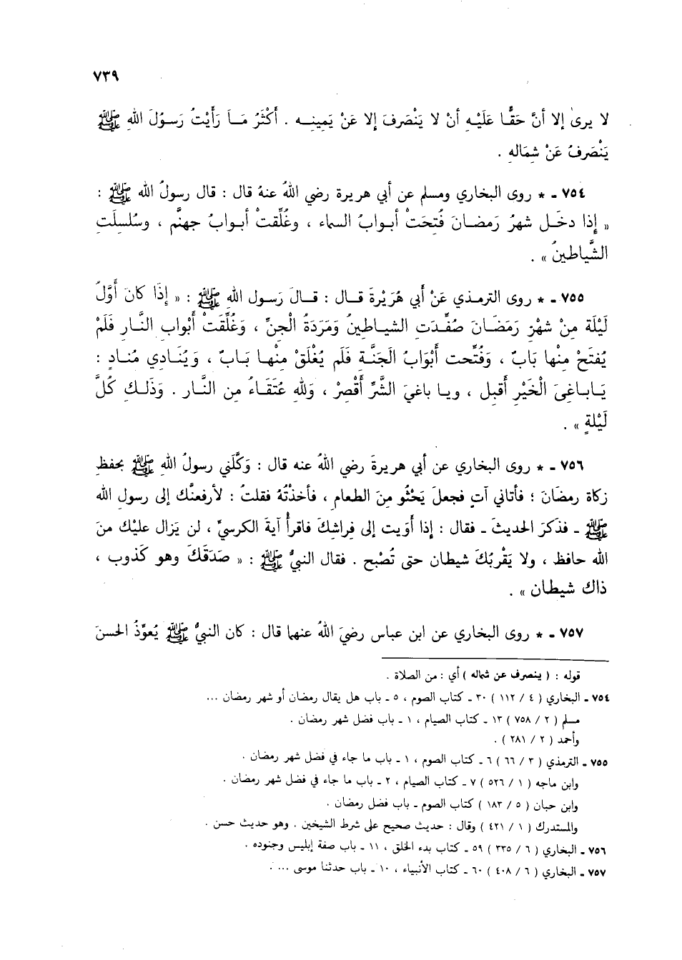 754 - * روى البخاري ومسلم عن أبي هريرة رضي الله عنه قال: قال رسول الله صلى الله عليه وسلم: "إذا دخل شهر رمضان فتحت أبواب السماء، وغلقت أبواب جهنم، وسلسلت الشياطين".