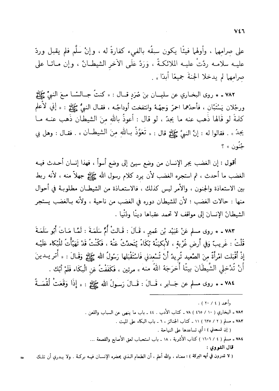 782 - * روى البخاري عن سليمان بن صردٍ قال: "كنت جالسًا مع النبي صلى الله عليه وسلم ورجلان يستبان، فأحدهما احمر وجهه وانتفخت أوداجه، فقال النبي صلى الله عليه وسلم: "إني لأعلم كلمة لو قالها ذهب عنه ما يجد، لو قال: أعوذ بالله من الشيطان ذهب عنه ما يجد". فقالوا له: إن النبي صلى الله عليه وسلم قال: "تعوذ بالله من الشيطان". فقال: وهل بي جنون"؟.