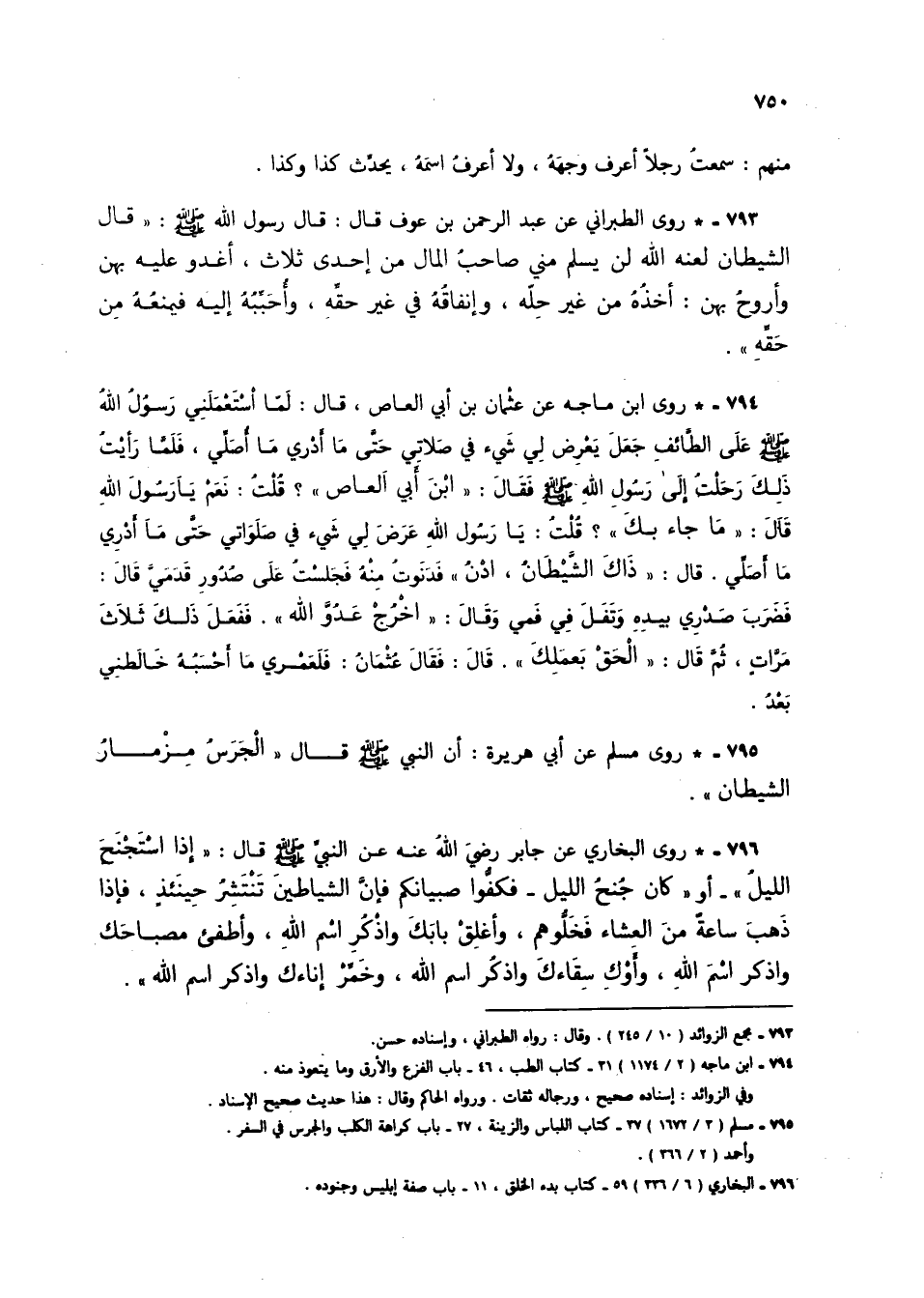 793 - * روى الطبراني عن عبد الرحمن بن عوف قال: قال رسول الله صلى الله عليه وسلم: "قال الشيطان لعنه الله لن يسلم مني صاحب المال من إحدى ثلاث، أغدو عليه بهن وأروح بهن: أخذه من غير حله، وإنفاقه في غير حقه، وأحببه إليه فيمنعه من حقه".