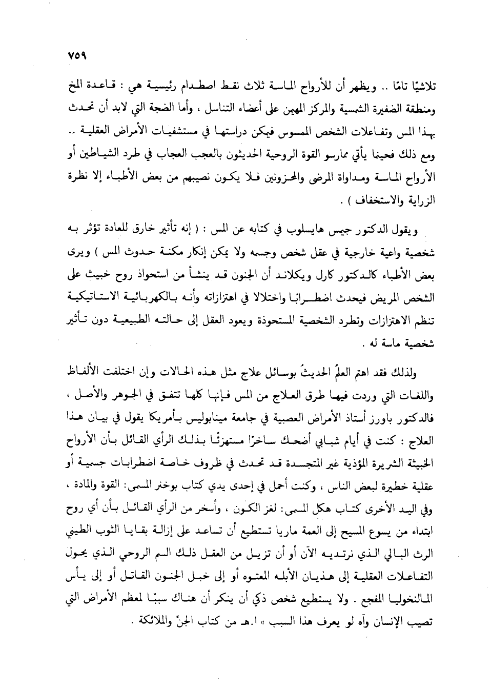 تلاشيًا تامًا .. ويظهر أن للأرواح الماسة ثلاث نقط اصطدام رئيسية هي: قاعدة المخ ومنطقة الضفيرة الشمسية والمركز المهيمن على أعضاء التناسل، وأما الضجة التي لابد أن تحدث بهذا المس وتفاعلات الشخص الممسوس فيمكن دراستها في مستشفيات الأمراض العقلية ... ومع ذلك فحينما يأتي ممارسو القوة الروحية الحديثون بالعجب العجاب في طرد الشياطين أو الأرواح الماسة ومداواة المرضى والمحزونين فلا يكون نصيبهم من بعض الأطباء إلا نظرة الزراية والاستخفاف).
