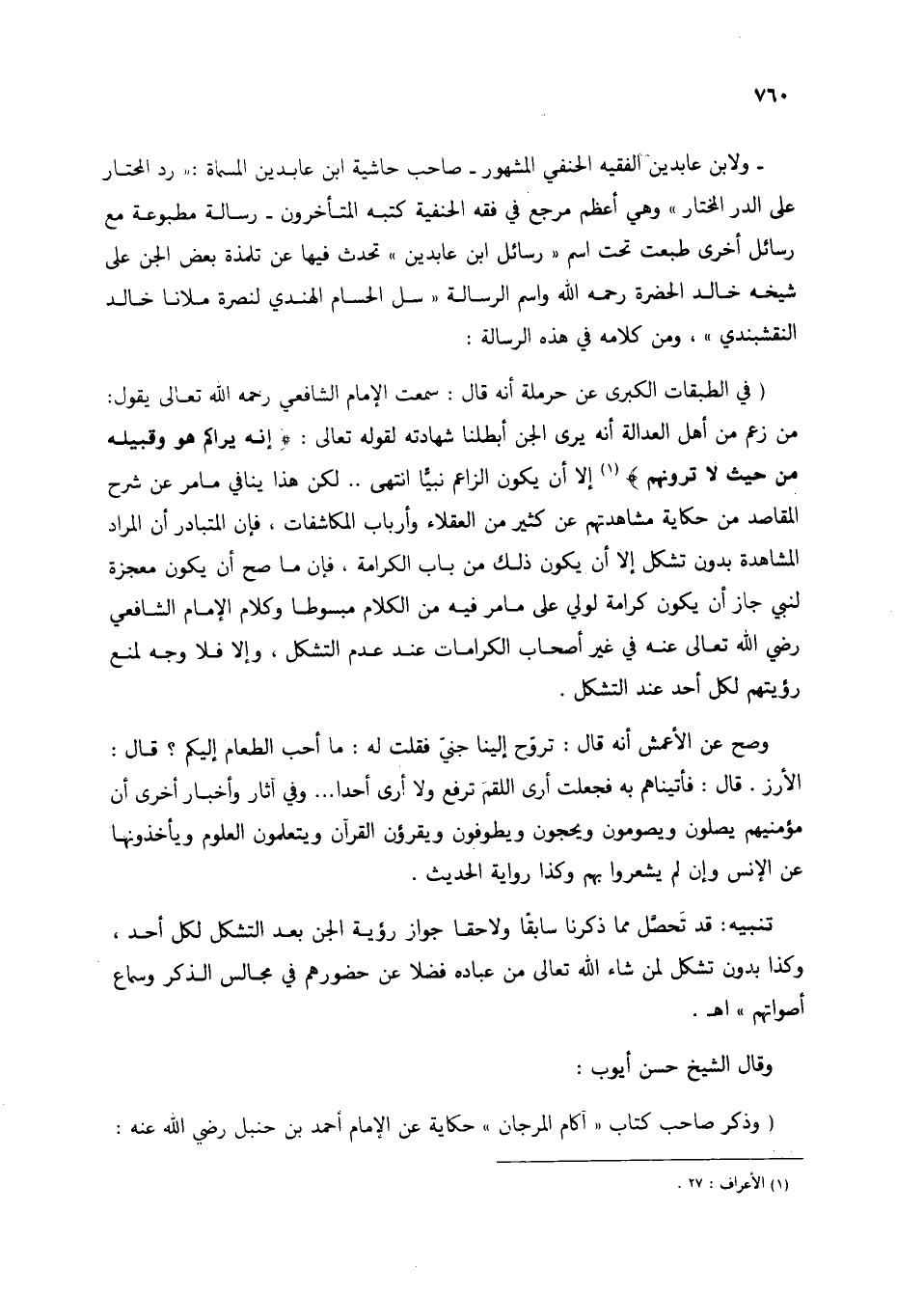 (في الطبقات الكبرى عن حرملة أنه قال: سمعت الإمام الشافعي رحمه الله تعالى يقول: من زعم من أهل العدالة أنه يرى الجن أبطلنا شهادته لقوله تعالى: {إِنَّهُ يَرَاكُمْ هُوَ وَقَبِيلُهُ مِنْ حَيْثُ لَا تَرَوْنَهُمْ} (1) إلا أن يكون الزاعم نبيًا انتهى ... لكن هذا ينافي ما مر عن شرح المقاصد من حكاية مشاهدتهم عن كثير من العقلاء وأرباب المكاشفات، فإن المتبادر أن المراد المشاهدة بدون تشكل إلا أن يكون ذلك من باب الكرامة، فإن ما صح أن يكون معجزة لنبي جاز أن يكون كرامة لولي على ما مر فيه من الكلام مبسوطًا وكلام الإمام الشافعي رضي الله تعالى عنه في غير أصحاب الكرامات عند عدم التشكل، وإلا فلا وجه لمنع رؤيتهم لكل أحد عند التشكل.