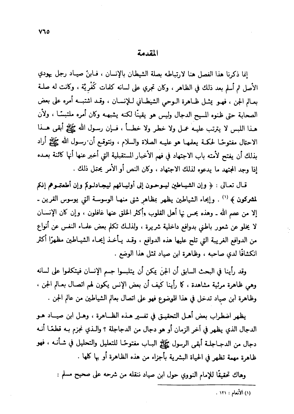 إنما ذكرنا هذا الفصل هنا لارتباطه بصلة الشيطان بالإنسان، فابن صياد رجل يهودي الأصل ثم أسلم بعد ذلك في الظاهر، وكان تجري على لسانه كلمات كفرية، وكانت له صلة بعالم الجن، فهو يمثل ظاهرة الوحي الشيطاني للإنسان، وقد اشتبه أمره على بعض الصحابة حتى ظنوه المسيح الدجال وليس هو يقينًا لكنه يشبهه وكان أمره ملتبسًا، ولأن هذا اللبس لا يترتب عليه عمل ولا خطر ولا خطأ، فإن رسول الله صلى الله عليه وسلم أبقى هذا الاحتمال مفتوحًا لحكمة يعلمها هو عليه الصلاة والسلام، ونتوقع أن رسول الله صلى الله عليه وسلم أراد بذلك أن يفتح لأمته باب الاجتهاد في فهم الأخبار المستقبلية التي أخبر عنها أنها كائنة بعده إذا وجد المجتهد ما يدعوه لذلك الاجتهاد، وكان النص أو الأمر يحتمل ذلك.