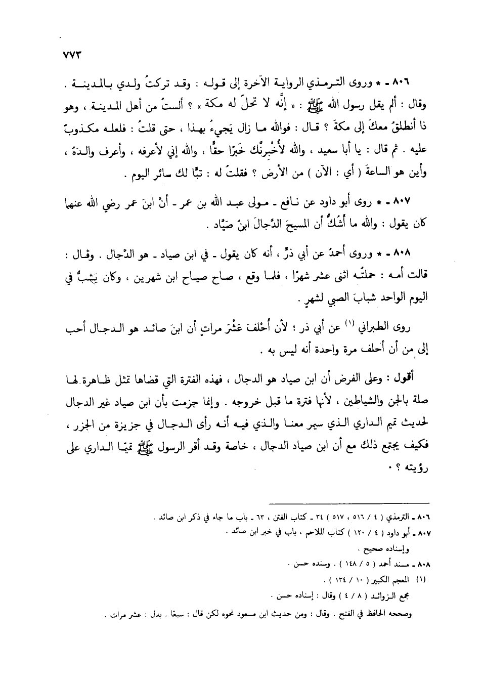 807 - * روى أبو داود عن نافع - مولى عبد الله بن عمر - أن ابن عمر رضي الله عنهما كان يقول: والله ما أشك أن المسيح الدجال ابن صياد.