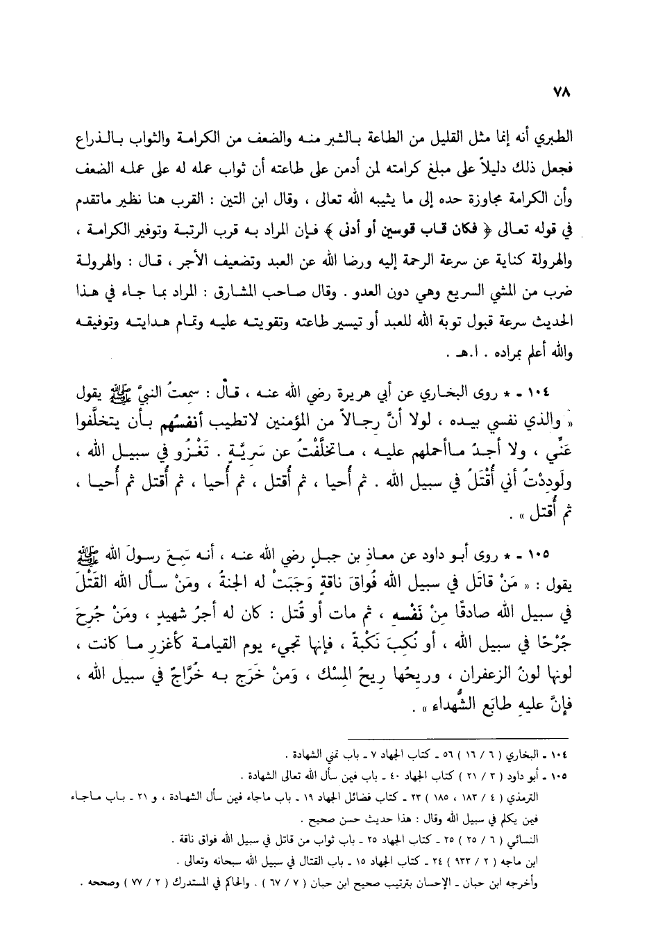 105 - * روى أبو داود عن معاذ ابن جبل رضي الله عنه، أنه سمع رسول الله صلى الله عليه وسلم يقول: "من قاتل في سبيل الله فواق ناقة وجبت له الجنة، ومن سأل الله القتل في سبيل الله صادقاً من نفسه، ثم مات أو قتل: كان له أجر شهيد، ومن جرح جرحاً في سبيل الله، أو نكب نكبة، فإنها تجيء يوم القيامة كأغزر ما كانت، لونها لون الزعفران، وريحها ريح المسك، ومن خرج به خراج في سبيل الله، فإن عليه طابع الشهداء".