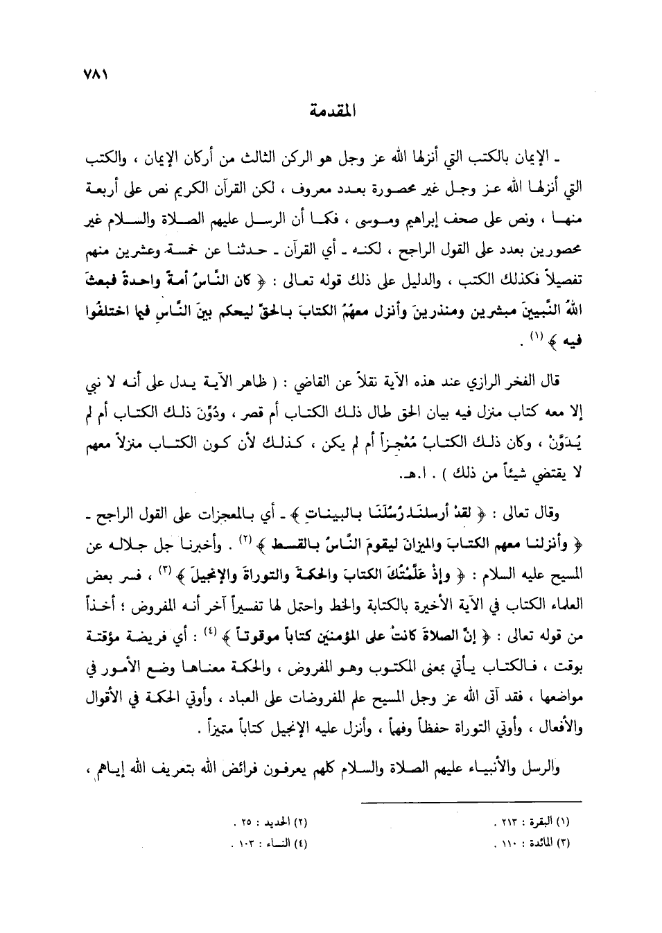 - الإيمان بالكتب التي أنزلها الله عز وجل هو الركن الثالث من أركان الإيمان، والكتب التي أنزلها الله عز وجل غير محصورة بعدد معروف، لكن القرآن الكريم نص على أربعة منها، ونص على صحف إبراهم وموسى، فكا أن الرسل عليهم الصلاة والسلام غير محصورين بعدد على القول الراجح، لكنه - أي القرآن - حدثنا عن خمسة وعشرين منهم تفصيلًا فكذلك الكتب، والدليل على ذلك قوله تعالى: {كَانَ النَّاسُ أُمَّةً وَاحِدَةً فَبَعَثَ اللَّهُ النَّبِيِّينَ مُبَشِّرِينَ وَمُنْذِرِينَ وَأَنْزَلَ مَعَهُمُ الْكِتَابَ بِالْحَقِّ لِيَحْكُمَ بَيْنَ النَّاسِ فِيمَا اخْتَلَفُوا فِيهِ} (1).