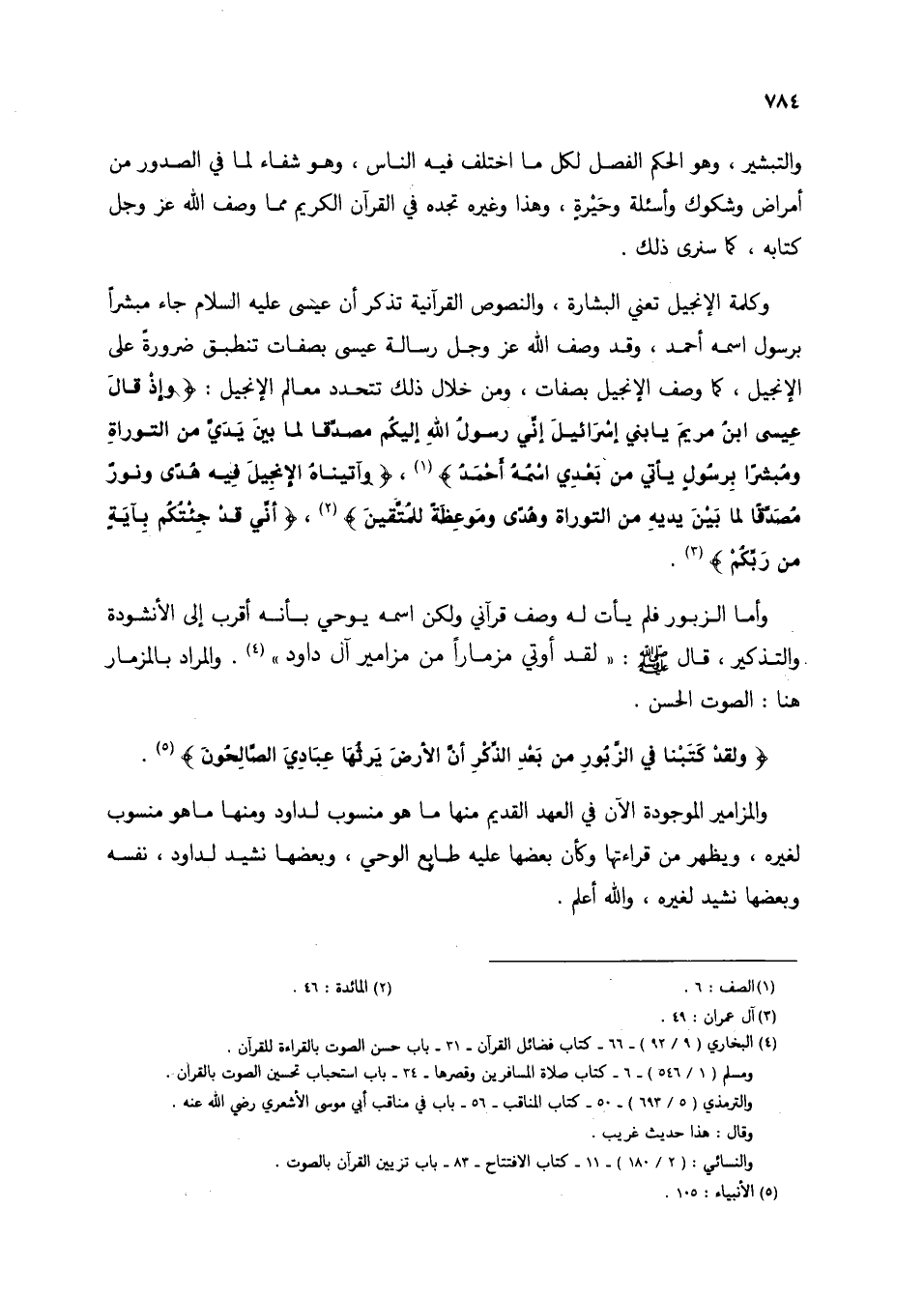 وأما الزبور فلم يأت له وصف قرآني ولكن اسمه يوحي بأنه أقرب إلى الأنشودة والتذكير، قال صلى الله عليه وسلم: (لقد أوتي مزمارًا من مزامير آل داود) (4). والمراد بالمزمار هنا: الصوت الحسن.