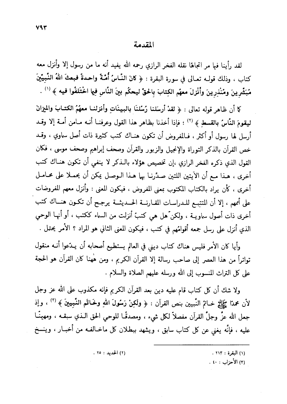 كما أن ظاهر قوله تعالى: {لَقَدْ أَرْسَلْنَا رُسُلَنَا بِالْبَيِّنَاتِ وَأَنْزَلْنَا مَعَهُمُ الْكِتَابَ وَالْمِيزَانَ لِيَقُومَ النَّاسُ بِالْقِسْطِ} (2)؛ فإذا أخذنا بظاهر هذا القول وعرفنا أنه ما من أمة إلا وقد أرسل لها رسول أو أكثر، فالمفروض أن تكون هناك كتب كثيرة ذات أصل سماوي، وقد خص القرآن بالذكر التوراة والإنجيل والزبور والقرآن وصحف إبراهم وصحف موسى، فكان القول الذي ذكره الفخر الرازي إن تخصيص هؤلاء بالذكر لا ينفي أن تكون هناك كتب أخرى، هذا مع أن الآيتين اللتين صدرنا بها هذا الوصل يمكن أن يحملا على محامل أخرى، كأن يراد بالكتاب المكتوب بمعنى المفروض، فيكون المعنى: وأنزل معهم المفروضات على أمهم، إلا أن المتتبع للدراسات المقارنة الحديثة يرجح أن تكون هناك كتب أخرى ذات أصول سماوية، ولكن هل هي كتب أنزلت من السماء ككتب، أو أنها الوحي الذي أنزل على رسل جمعه أقوامهم في كتب، فيكون المعنى الثاني هو المراد؟ الأمر يحتمل.