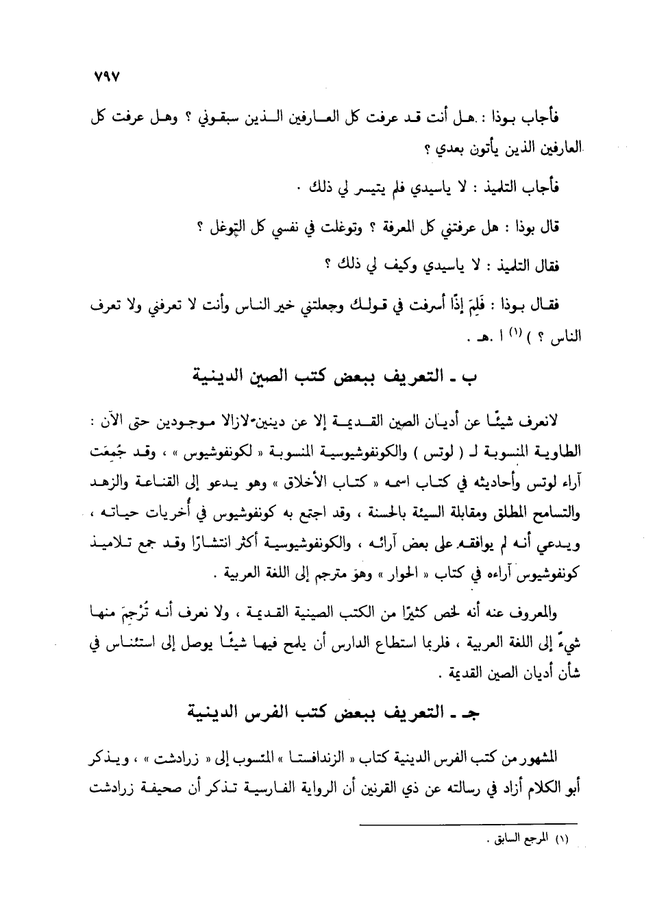 فقال بوذا: فلم إذًا أسرفت في قولك وجعلتني خير الناس وأنت لا تعرفني ولا تعرف الناس؟) (1) ا. هـ.