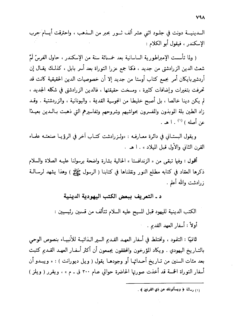 أقول: وفيما تبقى من (الزندافستا) الحالية بشارة واضحة برسولنا عليه الصلاة والسلام ذكرها العقاد في كتابه مطلع النور ونقلناها في كتابنا (الرسول صلى الله عليه وسلم) وهذا يشهد لرسالة زرادشت والله أعلم.