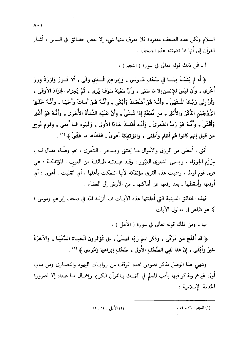 {أَمْ لَمْ يُنَبَّأْ بِمَا فِي صُحُفِ مُوسَى * وَإِبْرَاهِيمَ الَّذِي وَفَّى * أَلَّا تَزِرُ وَازِرَةٌ وِزْرَ أُخْرَى * وَأَنْ لَيْسَ لِلْإِنْسَانِ إِلَّا مَا سَعَى * وَأَنَّ سَعْيَهُ سَوْفَ يُرَى * ثُمَّ يُجْزَاهُ الْجَزَاءَ الْأَوْفَى * وَأَنَّ إِلَى رَبِّكَ الْمُنْتَهَى * وَأَنَّهُ هُوَ أَضْحَكَ وَأَبْكَى * وَأَنَّهُ هُوَ أَمَاتَ وَأَحْيَا * وَأَنَّهُ خَلَقَ الزَّوْجَيْنِ الذَّكَرَ وَالْأُنْثَى * مِنْ نُطْفَةٍ إِذَا تُمْنَى * وَأَنَّ عَلَيْهِ النَّشْأَةَ الْأُخْرَى * وَأَنَّهُ هُوَ أَغْنَى وَأَقْنَى * وَأَنَّهُ هُوَ رَبُّ الشِّعْرَى * وَأَنَّهُ أَهْلَكَ عَادًا الْأُولَى * وَثَمُودَ فَمَا أَبْقَى * وَقَوْمَ نُوحٍ مِنْ قَبْلُ إِنَّهُمْ كَانُوا هُمْ أَظْلَمَ وَأَطْغَى * وَالْمُؤْتَفِكَةَ أَهْوَى * فَغَشَّاهَا مَا غَشَّى} (1). أقنى: أعطى من الرزق والأموال ما يقتنى ويدخر، الشعرى: نجم وضاء يقال له: قرى قوم لوط، وسميت هذه القرى مؤتفكة لأنها ائتفكت بأهلها، أي انقلبت. أهوى: أي أوقعها وأسقطها - بعد رفعها عن أماكنها - من الأرض إلى الفضاء.