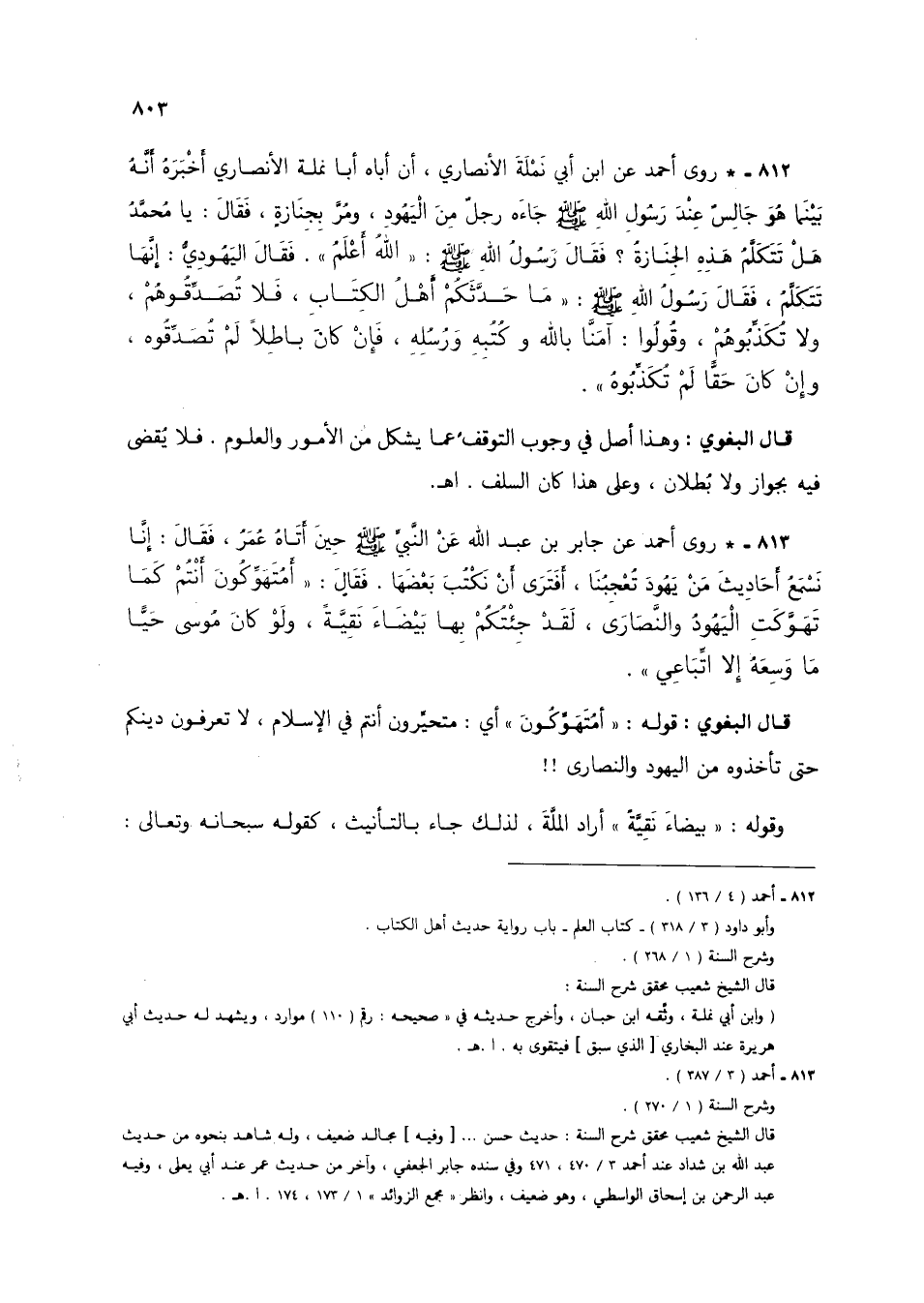 813 - * روى أحمد عن جابر بن عبد الله عن النبي صلى الله عليه وسلم حين أتاه عمر، فقال: إنا نسمع أحاديث من يهود تعجبنا، أفترى أن نكتب بعضها. فقال: (أمتهوكون أنتم كما تهوكت اليهود والنصارى، لقد جئتكم بها بيضاء نقيةً، ولو كان موسى حيًّا ما وسعه إلا اتباعي).