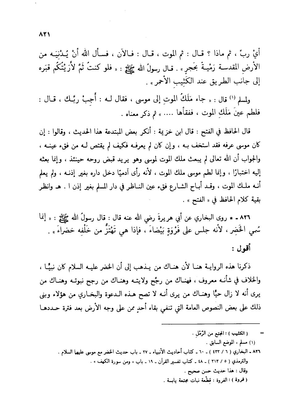 826 - * روى البخاري عن أبي هريرة رضي الله عنه قال: قال رسول الله صلى الله عليه وسلم: (إنما سمي الخضر، لأنه جلس على فروةٍ بيضاء، فإذا هي تهتز من خلفه خضراء).