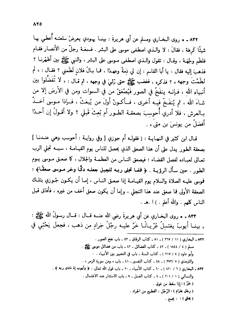 832 - * روى البخاري ومسلم عن أبي هريرة: بينا يهودي يعرض سلعته أعطي بها شيئًا كرهه، فقال: لا والذي اصطفى موسى على البشر، فسمعه رجلٌ من الأنصار فقام فلطم وجهه، وقال: تقول والذي اصطفى موسى على البشر، والنبي صلى الله عليه وسلم بين أظهرنا؟ فذهب إليه فقال: يا أبا القاسم: إن لي ذمةً وعهدًا، فما بال فلانٍ لطمني؟ فقال: (لم لطمُت وجهه)؟ فذكره، فغضب صلى الله عليه وسلم حتى رئي في وجهه، ثم قال: (لا تفضلوا بين أنبياء الله، فإنه ينفخ في الصور فيصعق من في السموات ومن في الأرض إلا من شاء الله، ثم يُنفَخ فيه أخرى، فأكون أول من يُبعث، فإذا موسى آخذٌ بالعرش، فلا أدري أحوسبة بصعقة الطور أم بعث قبلي؟ ولا أقول إن أحدًا أفضل من يونس بن متى).