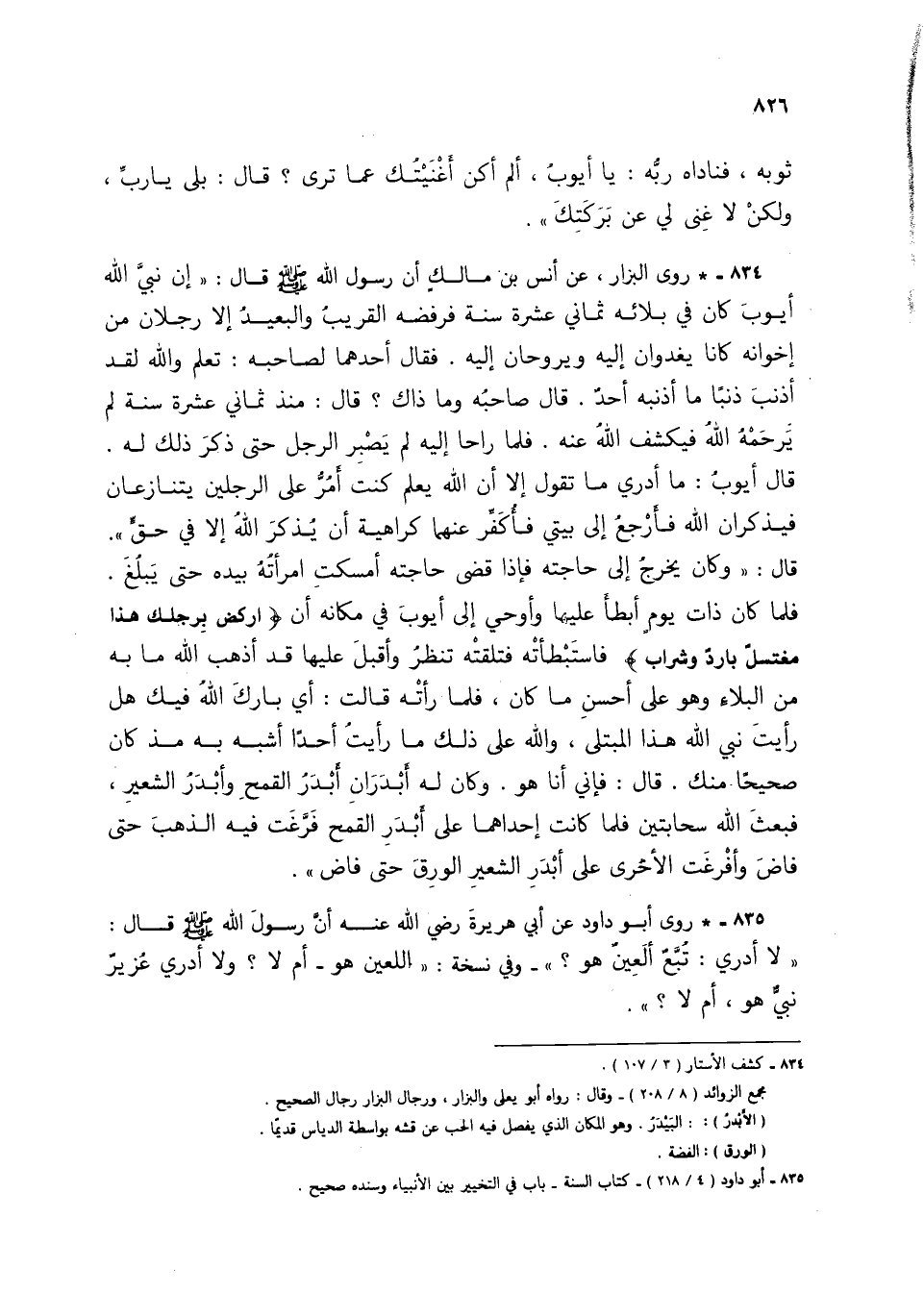 834 - * روى البزار، عن أنس بن مالكٍ أن رسول الله صلى الله عليه وسلم قال: (إن نبي الله أيوب كان في بلائه ثماني عشرة سنة فرفضه القريب والبعيد إلا رجلان من إخوانه كانا يغدوان إليه ويروحان إليه. فقال أحدهما لصاحبه: تعلم والله لقد أذنب ذنبًا ما أذنبه أحدٌ. قال صاحبه وما ذاك؟ قال: منذ ثماني عشرة سنة لم يُرحَمُة الله فيكشف الله عنه. فلما راحا إليه لم يطير الرجل حتى ذكر ذلك له. قال أيوب: ما أدري ما تقول إلا أن الله يعلم كنت أمر على الرجلين يتنازعان فيذكران الله فأرجع إلى بيتي فأكفر عنها كراهية أن يُذكر الله إلا في حقٍّ). قال: (وكان يخرج إلى حاجته فإذا قضى حاجته أمسكت امرأته بيده حتى يبلغ. فلما كان ذات يومٍ أبطأ عليها وأوحي إلى أيوب في مكانه أن {ارْكُضْ بِرِجْلِكَ هَذَا مُغْتَسَلٌ بَارِدٌ وَشَرَابٌ} فاستبطأته فتلقته تنظرُ وأقبل عليها قد أذهب الله ما به من البلاء وهو على أحسن ما كان، فلما رأته قالت: أي بارك الله فيك هل رأيت نبي الله هذا المبتلى، والله على ذلك ما رأيت أحدًا أشبه به مذ كان صحيحًا منك. قال: فإني أنا هو. وكان له أبدران أبدر القمح وأبدرُ الشعير، فبعث الله سحابتين فلما كانت إحداها على أبدر القمح فرغت فيه الذهب حتى فاض وأفرغت الأخرى على أبدر الشعير الورق حتى فاض).