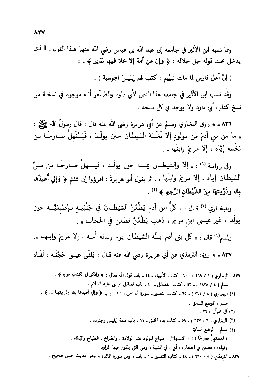 836 - * روى البخاري ومسلم عن أبي هريرة رضى الله عنه قال: قال رسول الله صلى الله عليه وسلم: وما من بني آدم من مولود إلا نخسه الشيطان حين يولد، فيستهل صارخًا من نخسه إيّاه، إلا مريم وابنها).