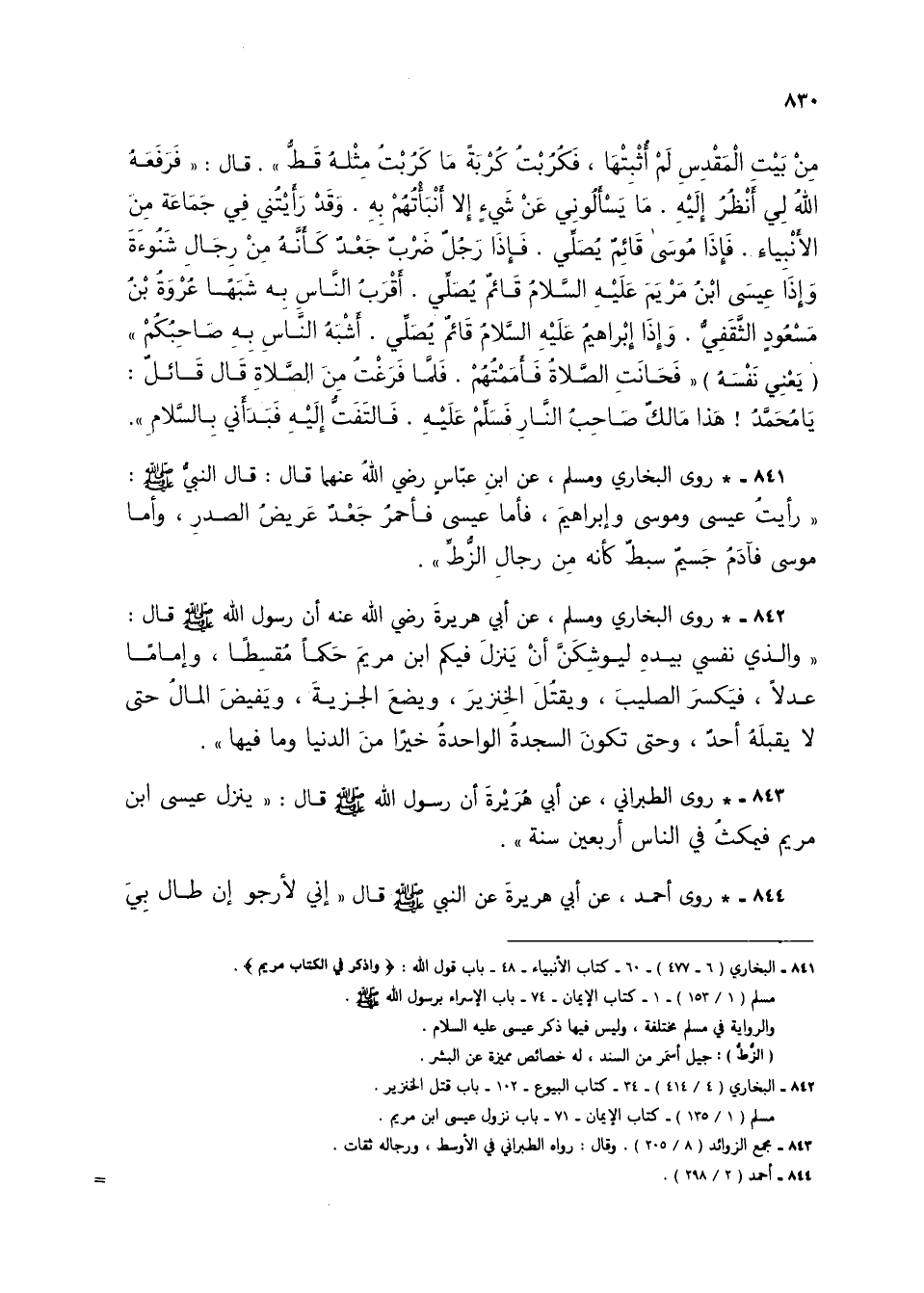 842 - * روى البخاري ومسلم، عن أبي هريرة رضي الله عنه أن رسول الله صلى الله عليه وسلم قال: (والذي نفسي بيده ليوشكن أن ينزل فيكم ابن مريم حكمًا مقسطًا، وإمامًا عدلًا، فيكسر الصليب، ويقتل الخنزير، ويضع الجزية، ويفيض المال حتى لا يقبله أحدٌ، وحتى تكون السجدة الواحدة خيرًا من الدنيا وما فيها).