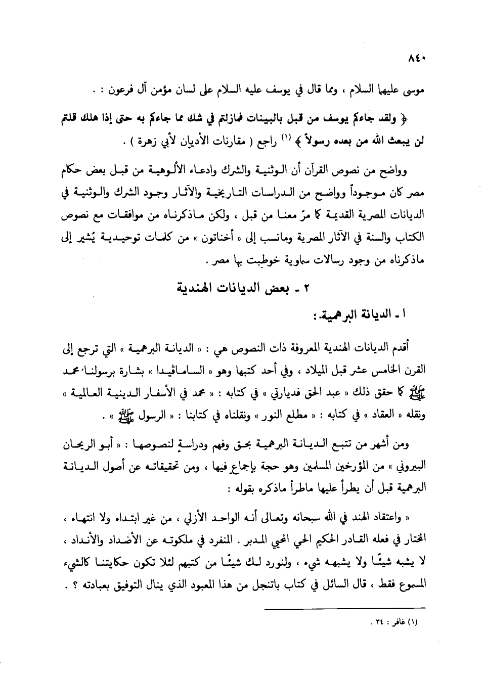 {وَلَقَدْ جَاءَكُمْ يُوسُفُ مِنْ قَبْلُ بِالْبَيِّنَاتِ فَمَا زِلْتُمْ فِي شَكٍّ مِمَّا جَاءَكُمْ بِهِ حَتَّى إِذَا هَلَكَ قُلْتُمْ لَنْ يَبْعَثَ اللَّهُ مِنْ بَعْدِهِ رَسُولًا} (1) راجع (مقارنات الأديان لأبي زهرة).