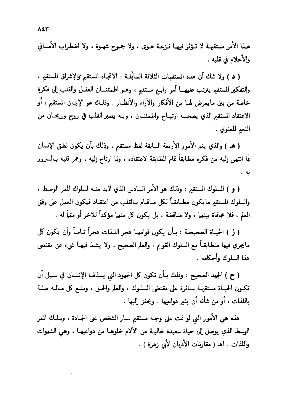 (ز) الحياة الصحيحة: بأن يكون قوامها هجر اللذات هجراً تاماً وأن يكون كل ما يجري فيها متطابقاً مع السلوك القويم، والعلم الصحيح، ولا يشذ فيها شيء عن مقتضى هذا السلوك وأحكامه.