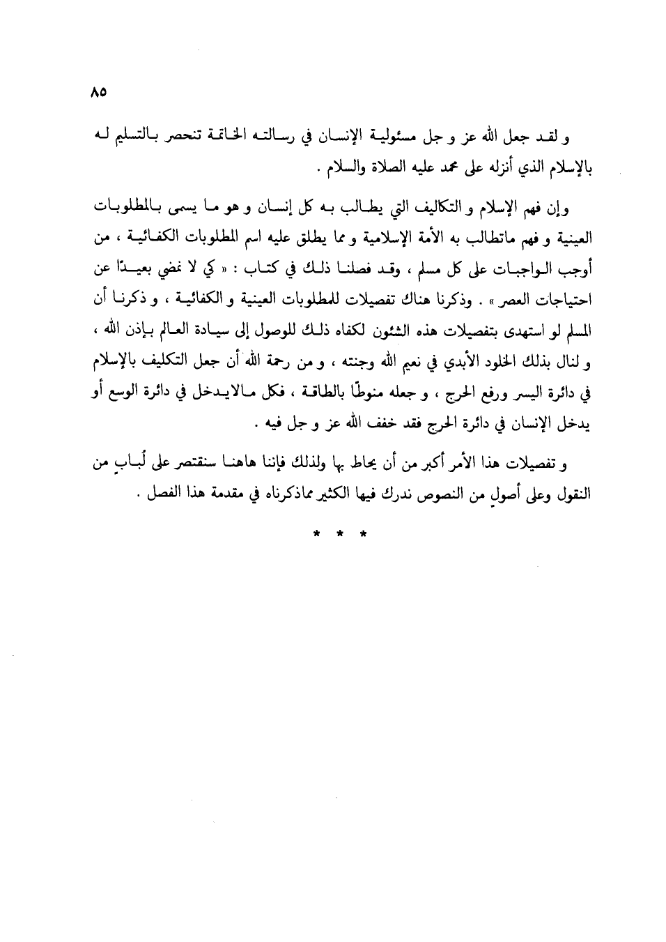 وإن فهم الإسلام والتكاليف التي يطالب به كل إنسان وهو ما يسمى بالمطلوبات العينية وفهم ما تطالب به الأمة الإسلامية ومما يطلق عليه اسم المطلوبات الكفائية، من أوجب الواجبات على كل مسلم، وقد فصلنا ذلك في كتاب: "كي لا نمضي بعيداً عن احتياجات العصر". وذكرنا هناك تفصيلات للمطلوبات العينية والكفائية، وذكرنا أن المسلم لو استهدى بتفصيلات هذه الشئون لكفاه ذلك للوصول إلى سيادة العالم بإذن الله، ولنال بذلك الخلود الأبدي في نعيم الله وجنته، ومن رحمة الله أن جعل التكليف بالإسلام في دائرة اليسر ورفع الحرج، وجعله متوطاً بالطاقة، فكل ما لا يدخل في دائرة الوسع أو يدخل الإنسان في دائرة الحرج فقد خفف الله عز وجل فيه.