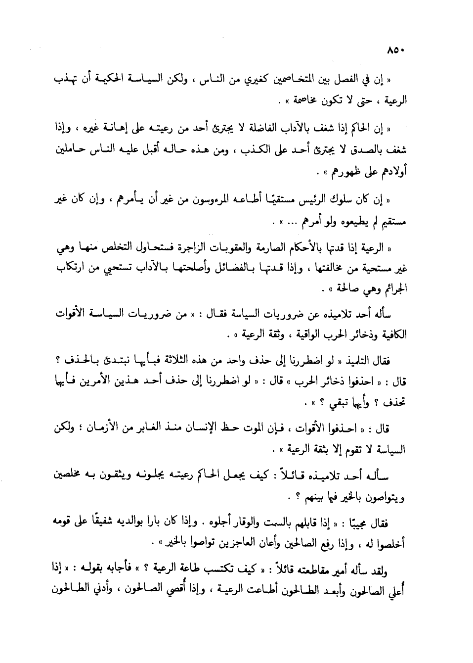 سأله أحد تلاميذه عن ضروريات السياسة فقال: "من ضروريات السياسة الأقوات الكافية وذخائر الحرب الواقية، وثقة الرعية".