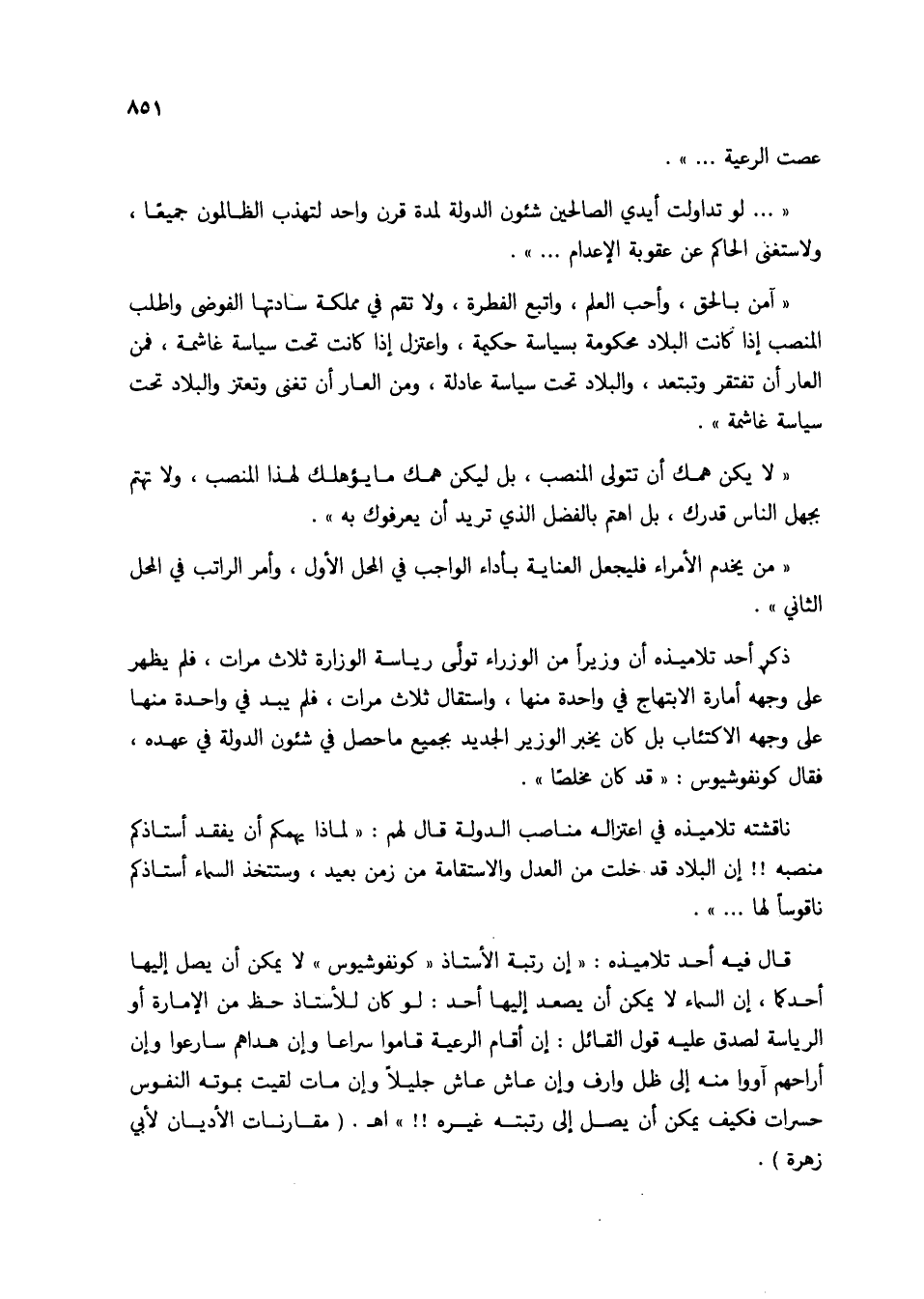 (آمن بالحق، وأحب العلم، واتبع الفطرة، ولا تقم في مملكة سادتها الفوضى واطلب المنصب إذا كانت البلاد محكومة بسياسة حكيمة، واعتزل إذا كانت تحت سياسة غاشمة، فمن العار أن تفتقر وتبتعد، والبلاد تحت سياسة عادلة، ومن العار أن تغنى وتعتز والبلاد تحت سياسة غاشمة).
