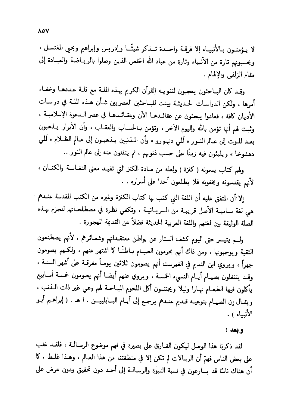 وقد كان الباحثون يعجبون لتنويه القرآن الكريم بهذه الملة مع قلة عددها وخفاء أمرها، ولكن الدراسات الحديثة بينت للباحثين العصريين شأن هذه الملة في دراسات الأديان كافة، فعادوا يبحثون عن عقائدهم الآن وعقائدهم في عصر الدعوة الإسلامية، وثبت لهم أنها تؤمن بالله واليوم الآخر، وتؤمن بالحساب والعقاب، وأن الأبرار يذهبون بعد الموت إلى عالم النور (آلمي دنهورو) وأن المذنبين يذهبون إلى عالم الظلام (آلمي دهشوخا) ويلبثون فيه زمنًا على حسب ذنوبهم، ثم ينقلون منه إلى عالم النور ..
