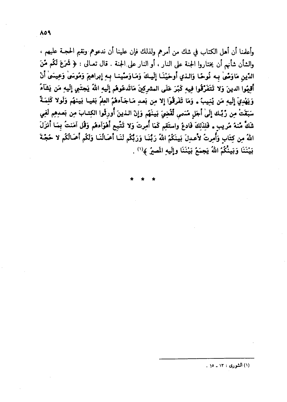 وأعلمنا أن أهل الكتاب في شك من أمرهم ولذلك فإن علينا أن ندعوهم ونقيم الحجة عليهم، والشأن شأنهم أن يختاروا الجنة على النار، أو النار على الجنة. قال تعالى: {شَرَعَ لَكُمْ مِنَ الدِّينِ مَا وَصَّى بِهِ نُوحًا وَالَّذِي أَوْحَيْنَا إِلَيْكَ وَمَا وَصَّيْنَا بِهِ إِبْرَاهِيمَ وَمُوسَى وَعِيسَى أَنْ أَقِيمُوا الدِّينَ وَلَا تَتَفَرَّقُوا فِيهِ كَبُرَ عَلَى الْمُشْرِكِينَ مَا تَدْعُوهُمْ إِلَيْهِ اللَّهُ يَجْتَبِي إِلَيْهِ مَنْ يَشَاءُ وَيَهْدِي إِلَيْهِ مَنْ يُنِيبُ * وَمَا تَفَرَّقُوا إِلَّا مِنْ بَعْدِ مَا جَاءَهُمُ الْعِلْمُ بَغْيًا بَيْنَهُمْ وَلَوْلَا كَلِمَةٌ سَبَقَتْ مِنْ رَبِّكَ إِلَى أَجَلٍ مُسَمًّى لَقُضِيَ بَيْنَهُمْ وَإِنَّ الَّذِينَ أُورِثُوا الْكِتَابَ مِنْ بَعْدِهِمْ لَفِي شَكٍّ مِنْهُ مُرِيبٍ * فَلِذَلِكَ فَادْعُ وَاسْتَقِمْ كَمَا أُمِرْتَ وَلَا تَتَّبِعْ أَهْوَاءَهُمْ وَقُلْ آمَنْتُ بِمَا أَنْزَلَ اللَّهُ مِنْ كِتَابٍ وَأُمِرْتُ لِأَعْدِلَ بَيْنَكُمُ اللَّهُ رَبُّنَا وَرَبُّكُمْ لَنَا أَعْمَالُنَا وَلَكُمْ أَعْمَالُكُمْ لَا حُجَّةَ بَيْنَنَا وَبَيْنَكُمُ اللَّهُ يَجْمَعُ بَيْنَنَا} (1).