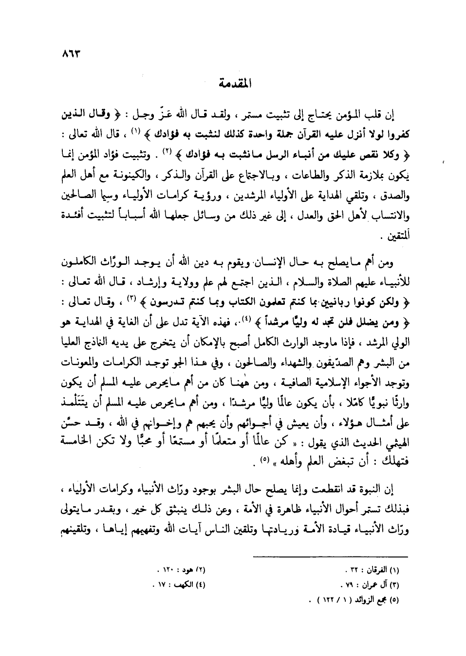 ومن أهم ما يصلح به حال الإنسان. ويقوم به دين الله أن يوجد الوراث الكاملون للأنبياء عليهم الصلاة والسلام، الذين أجتمع لهم علم وولاية وإرشاد، قال الله تعالى: {وَلَكِنْ كُونُوا رَبَّانِيِّينَ بِمَا كُنْتُمْ تُعَلِّمُونَ الْكِتَابَ وَبِمَا كُنْتُمْ تَدْرُسُونَ} (3)، وقال الله تعالى: {وَمَنْ يُضْلِلْ فَلَنْ تَجِدَ لَهُ وَلِيًّا مُرْشِدًا} (4)، فهذه الآية تدل على أن الغاية في الهداية هو الولي المرشد، فإذا ما وجد الوارث الكامل أصبح بالإمكان أن يتخرج على يديه النماذج العليا من البشر وهم الصديقون والشهداء والصالحون، وفي هذا الجو توجد كرامات والمعونات وتوجد الأجواء الإسلامية الصافية، ومن ههنا كان من أهم ما يحرص عليه المسلم أن يكون وارثاً نبوياً كاملا، بأن يكون عالما وليا مرشدا، ومن أهم ما يحرص عليه المسلم أن يتتلمذ على أمثال هؤلاء، وأن يعيش في أجوائهم وأن يحبهم هو وإخوانهم في الله، وقد حسن الهيثمي الحديث الذي يقول: "كن عالماً أو متعلماً أو محباً ولا تكن الخامسة فتهلك: أن تبغض العلم وأهله" (5).