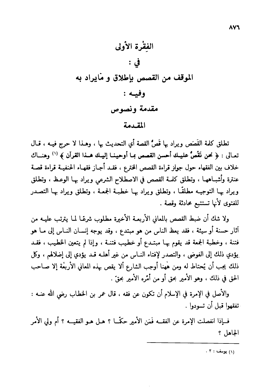 ولا شك أن ضبط القصص بالمعاني الأربعة الأخيرة مطلوب شرعاً لما يترتب عليه من آثار حسنة أو شيئة، فقد يعظ الناس من هو مبتدع، وقد يوجه إنسان الناس إلى ما هو فتنة، وخطبة الجمعة قد يقوم بها مبتدع أو خطيب فتنة، وخطبة الجمعة قد يقوم بها مبتدع أو خطيب فتنة، وإذا لم يتعين الخطيب، فقد يؤدي ذلك إلى الفوضى، والتصدر لإفتاء الناس من غير أهله قد يؤدي إلى إضلالهم، وكل ذلك يجب أن يحتاط له ومن ههنا أوجب الشارع ألا يقص بهذه المعاني الأربعة إلا صاحب الحق في ذلك، وهو الأمير بحق أو من أمره الأمير بحق.