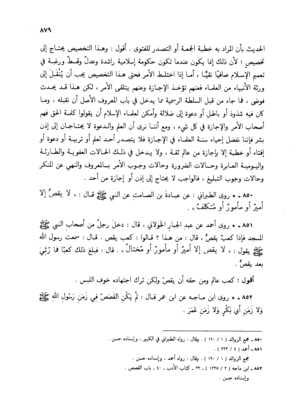 850 - * روى الطبراني: عن عبادة بن الصامت عن النبي صلى الله عليه وسلم قال: "لا يقص إلا أمير أو مأمور أو متكلف".