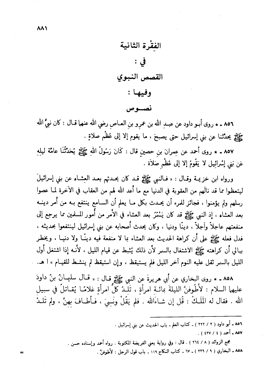 856 - * روى أبو داود عن عبد الله بن عمرو بن العاص رضي عنهما قال: كان نبي الله صلى الله عليه وسلم يحدثنا عن بني إسرائيل حتى يصبح، ما يقوم إلا إلى عظم صلاة.