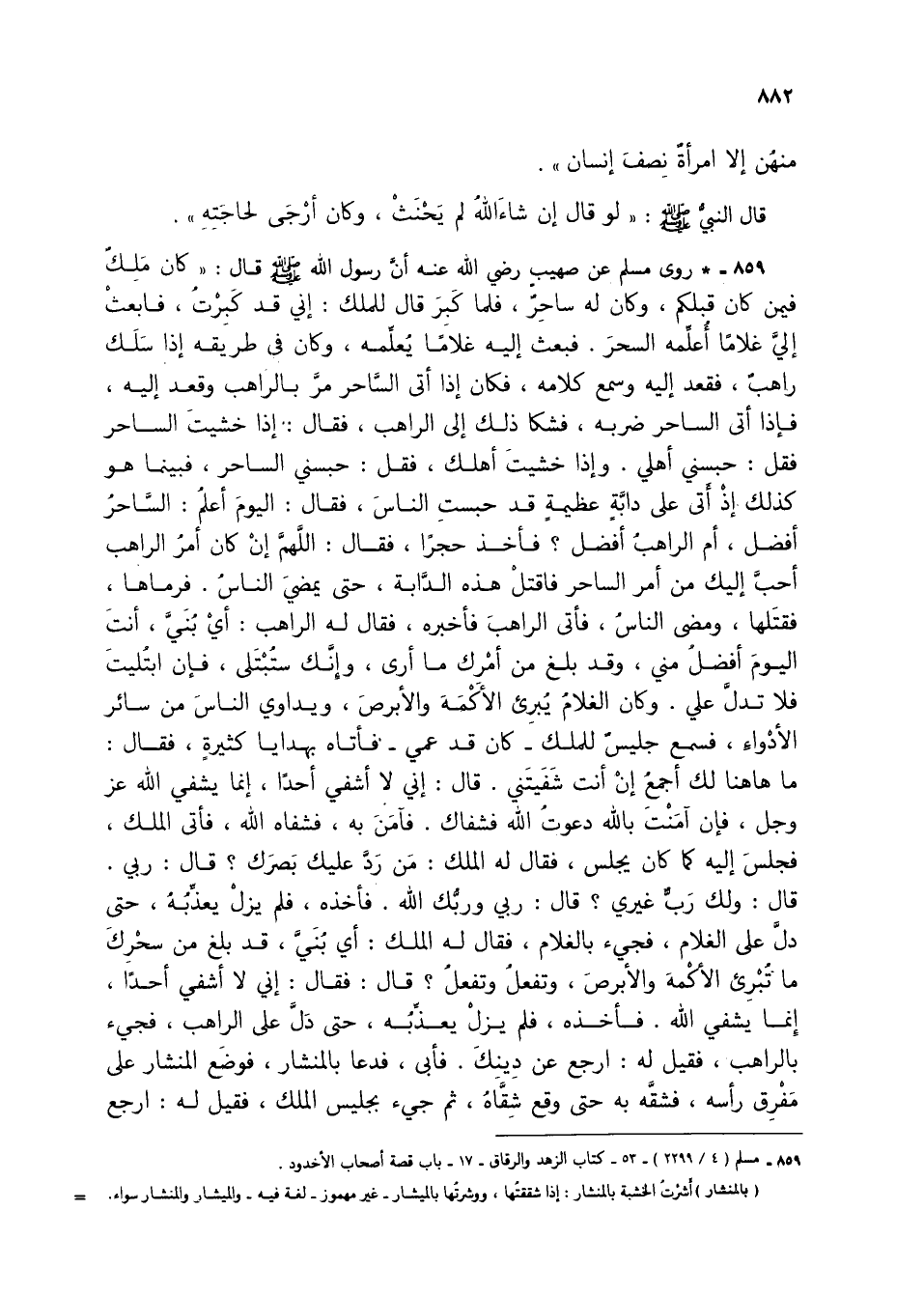 859 - * روى مسلم عن صهيب رضي الله عنه أن رسول الله صلى الله عليه وسلم قال: "كان ملك فيمن كان قبلكم، وكان له ساحر، فلما كبر قال للملك: إني قد كبرت، فابعث إلي غلاماً أعلمه السحر. فبعث إليه غلاماً يعلمه، وكان في طريقه إذا سلك راهب، فقعد إليه وسمع كلامه، فكان إذا أتى الساحر مر بالراهب وقعد إليه، فإذا أتى الساحر ضربه، فشكا ذلك إلى الراهب، فقال: إذا خشيت الساحر فقل: حبسني أهلي. وإذا خشيت أهلك، فقل: حبسني الساحر، فبينما هو كذلك إذ أتى على دابة عظيمة قد حبست الناس، فقال: اليوم أعلم: الساحر أفضل، أو الراهب أفضل؟ فأخذ حجراً، فقال: اللهم إن كان أمر الراهب أحب إليك من أمر الساحر فاقتل هذه الدابة، حتى يمضي الناس. فرماها، فقتلها، ومضى الناس، فأتى الراهب فأخبره، فقال له الراهب: أي بني، أنت اليوم أفضل مني، وقد بلغ من أمرك ما أرى، وإنك ستبتلي، فإن ابتليت فلا تدل علي. وكان الغلام يبرئ الأكمة والأبرض، ويداوي الناس من سائر الأدواء، فسمع جليس للملك - كان قد عمي - فأتاه بهدايا كثيرة، فقال: ما هاهنا لك أجمع إن أنت شفيتني. قال: إني لا أشفي أحداً، إنما يشفي الله عز وجل، فإن آمنت بالله دعوت الله فشفاك. فآمنت بالله فشفاك. فآمن به، فشفاه الله، فأتى الملك، فجلس إليه كما كان يجلس، فقال له الملك: من رد عليك بصرك؟ قال: ربي. قال: ولك رب غيري؟ قال: ربي وربك الله. فأخذه، فلم يزل يعذبه، حتى دل على الغلام، فجيء بالغلام، فقال له الملك: أي بني، قد بلغ من سحرك ما تبرئ الأكمة والأبرص، وتفعل وتفعل؟ قال: فقال: إني لا أشفي أحداً، إنما يشفي الله. فأخذه. فلم يزل يعذبه، حتى ذل على الراهب، فجيء بالراهب، فقيل له: ارجع عن دينك. فأبى، فدعا بالمنشار، فوضع المنشار على مفرق رأسه، فشقه به حتى وقع شقاه، ثم جيء بجليس الملك، فقيل له ارجع