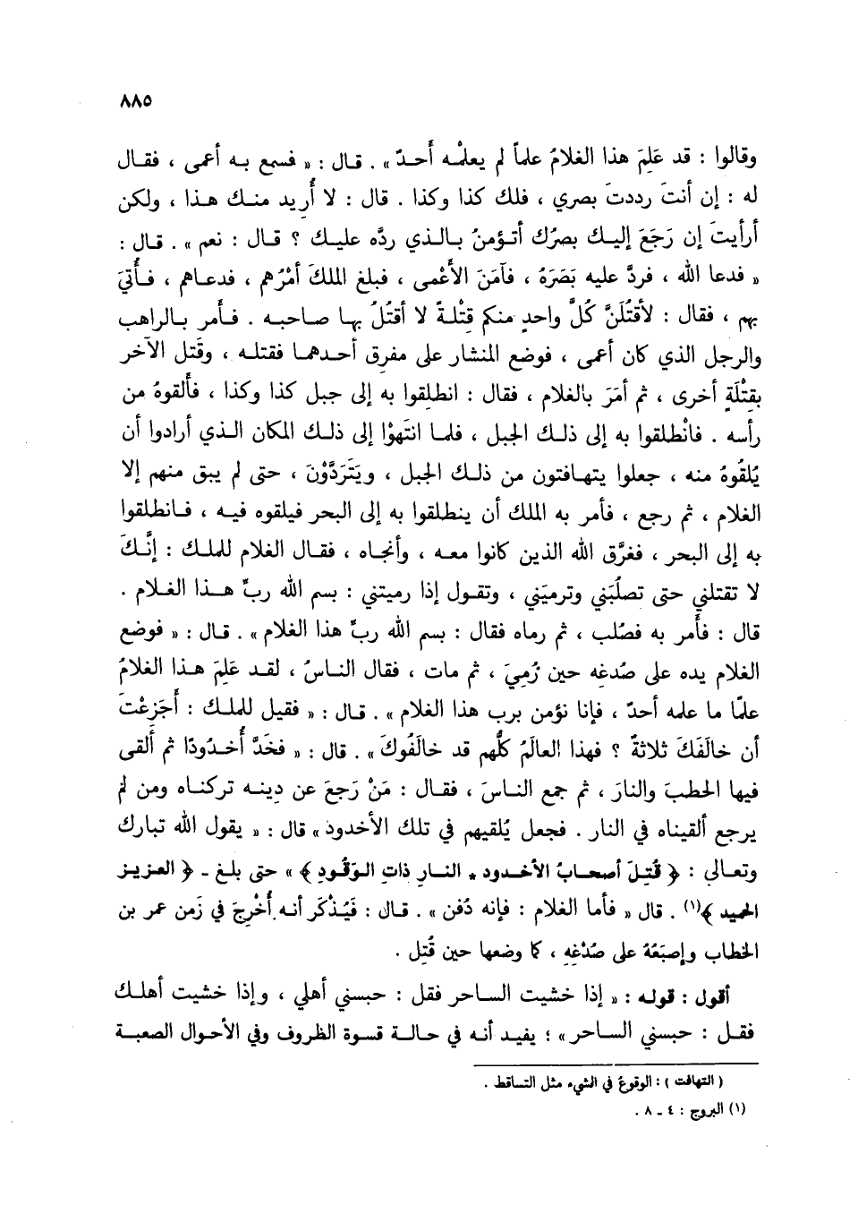 وقالوا: قد علم هذا الغلام علماً لم يعلمه أحد". قال: "فسمع به أعمى، فقال له: إن أنت رددت بصري، فلك كذا وكذا. قال: لا أريد منك هذا، ولكن أرأيت إن رجع إليك بصرك أتؤمن بالذي ررده عليك؟ قال: نعم". قال: "فدعا الله، فرد عليه بصره، فآمن الأعمى، فبلغ الملك أمرهم، فدعاهم، فأتي بهم، فقال: لأقتلن كل واحد منكم قتلة لا أقتل بها صاحبه. فأمر بالراهب والرجل الذي كان أعمى، فوضع المنشار على مفرق أحدهما فقتله، وقتل الآخر بقتلة أخرى، ثم أمر بالغلام، فقال: انطلقوا به إلى جبل كذا وكذا، فأبقوه من رأسه. فانطلقوا به إلى ذلك الجبل، فلما انتهوا إلى ذلك المكان الذي أرادوا أن يلقوه منه، جعلوا يتهافتون من ذلك الجبل، ويتردون، حتى لم يبق منهم إلا الغلام، ثم رجع، فأمر به الملك أن ينطلقوا به إلى البحر فيلقوه فيه، فانطلقوا به إلى البحر، فغرق الله الذين كانوا معه، وأنجاه، فقال الغلام للملك: إنك لا تقتلني حتى تصلبني وترميني، وتقول إذا رميتني: بسم الله رب هذا الغلام. قال: فأمر به فصلب، ثم رماه فقال: بسم الله رب هذا الغلام". قال: "فوضع الغلام يده على صدغه حين رمي، ثم مات، فقال الناس، لقد علم هذا الغلام علما ما علمه أحد، فإنا نؤمن برب هذا الغلام". قال: "فقيل للملك: أجزعت أن خالفك ثلاثة؟ فهذا العالم كلهم قد خالفوك". قال: "فخذ أخدودا ثم ألقى فيها الحطب والنار، ثم جمع الناس، فقال: من رجع عن دينه تركناه ومن ثم يرجع ألقيناه في النار. فجعل يلقيهم في تلك الأخدود" قال: "يقول الله تبارك وتعالى: (قتل أصحاب الأخدود، النار ذات الوقود) حتى بلغ - (العزيز الحميد) (1). قال "فأم الغالم: فإنه دفن". قال: فيذكر أنه أخرج في زمن عمر بن الخطاب وإصبعه على صدغه، كما وضعها حين قتل.