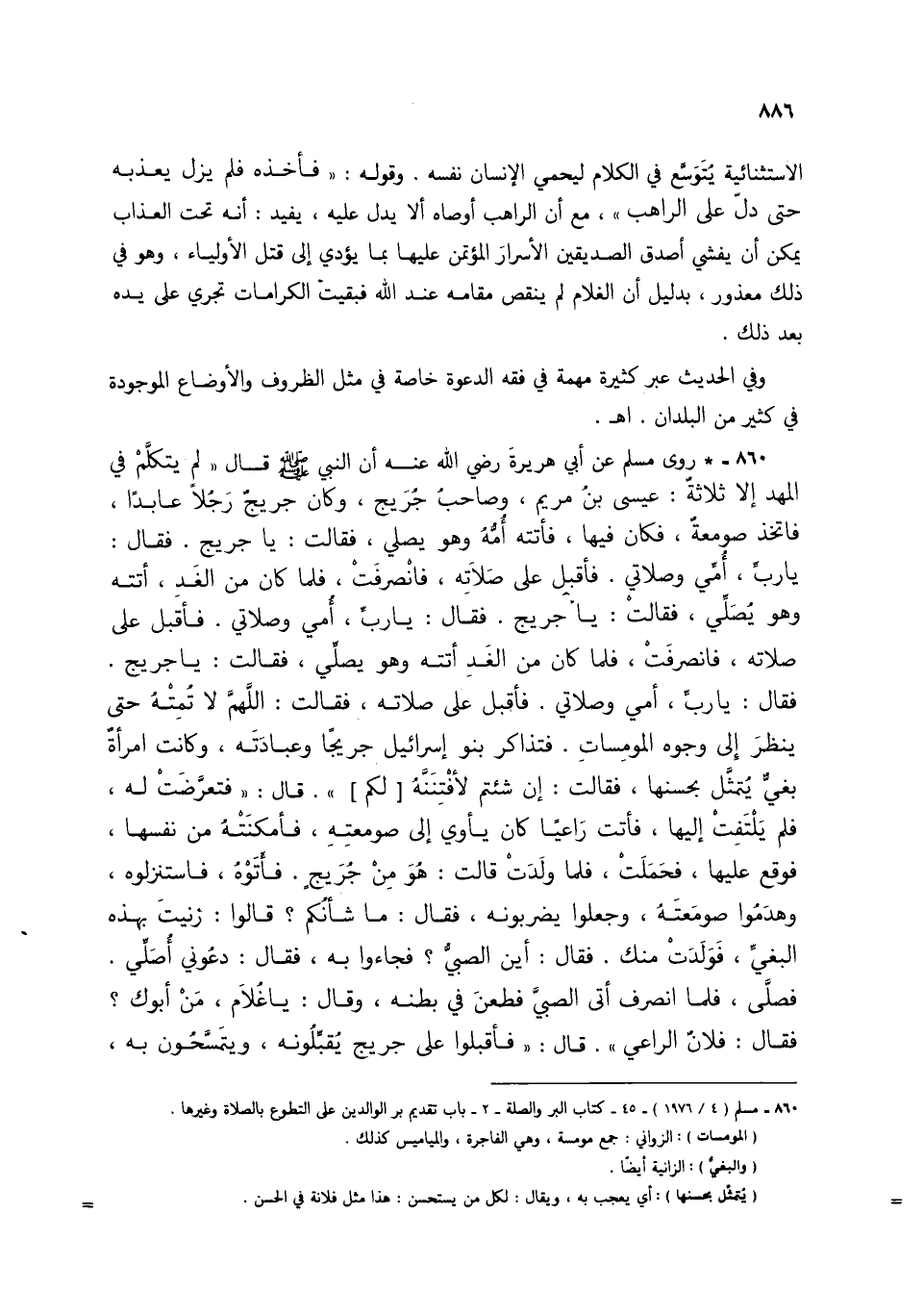 860 - * روى مسلم عن أبي هريرة رضي الله عنه أن النبي صلى الله عليه وسلم قال "لم يتكلم في المهد إلا ثلاثة: عيسى بن مريم، وصاحب جريج، وكان جريج رجلاً عابداً، فاتخذ صومعة، فكان فيها، فأتته أمه وهو يصلي، فقالت: يا جريج. فقال: يارب، أمي وصلاتي. فأقبل على صلاته، فانصرفت، فلما كان من الغد، أتته وهو يصلي، فقال: يا جريج. فقال: يارب، أمي وصلاتي. فأقبل على صلاته، فانصرفت، فلما كان من الغد أتته وهو يصلي، فقالت: يا جريج. فقال: يارب، أمي وصلاتي. فأقبل على صلاته، فقالت: اللهم لا تمته حتى ينظر إلى وجوه المومسات. فتذاكر بني إسرايل جريجاً وعبادته، وكانت امرأة بغي يتمثل بحسنها، فقالت: إن شئتم لأفتننه [لكم] ". قال: "فتعرضت له، فلم يلتفت إليها، فأتت راعياً كان يأوي إلى صومعته، فأمكنته من نفسها، فوقع عليها، فحملت، فلما ولدت قالت: هو من جريج. فأتوه، فاستنزلوه، وهدموا صومعته، وجعلوا يضربونه، فقال: ما شأنكم؟ قالوا: زنيت بهذه البغي، فولدت منك. فقال: أين الصبي؟ فجاءوا به، فقال: دعوني أصلي. فصلى، فلما انصرف أتى الصبي قطعن في بطنه، وقال: يا غلام، من أبوك؟ فقال: فلان الراعي". قال: "فأقبلوا على جريج يقبلونه، ويتمسحون به،