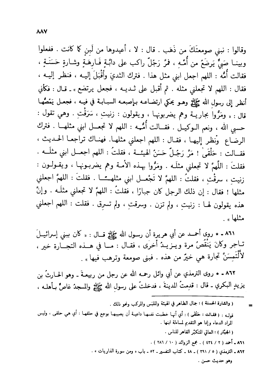 وقالوا: نبني صومعتك من ذهب. قال: لا، أعيدوها من لبن كما كانت. ففعلوا وبينا صبي يرضع من أمه، فمر رجل راكب على دابة فارهةٍ وشارة حسنةٍ، فقالت أمه: اللهم اجعل ابني مثل هذا. فترك الثدي وأقبل إليه، فنظر إليه، فقال: اللهم لا تجعلني مثله. ثم أقبل على ثديه، فجعل يرتضع" - قال: فكأني أنظر إلى رسول الله صلى الله عليه وسلم وهو يحكي ارتضاعه بإصبعه السبابة في فيه، فجعل يمصها قال: "ومروا بجارية وهم يضربونها، ويقولون: زنيت، سرقت. وهي تقول: حسبي الله، ونعم الوكيل. فقالت أمه: اللهم لا تجعل ابني مثلها. فترك الرضاع ونظر إليها، فقال: اللهم اجعلني مثلها. فهناك تراجعا الحديث، فقالت: حلقي! مر رجل حسن الهيئة، فقلت: اللهم اجعل ابني مثله. فقلت: اللهم لا تجعلني مثله. ومروا بهذه الأمة وهو يضربونها، ويقولون: زنيت، سرقت، فقلت: اللهم لا تجعل ابني مثلها. فقلت: اللهم اجعلني مثلها! فقالت: إ'ن ذلك الرجل كان جباراً، فقلت: اللهم لا تجعلني مثله. وإن هذه يقولون لها: زنيت، ولم تزن. وسرقت، ولم تسرق. فقلت: اللهم اجعلني مثلها".