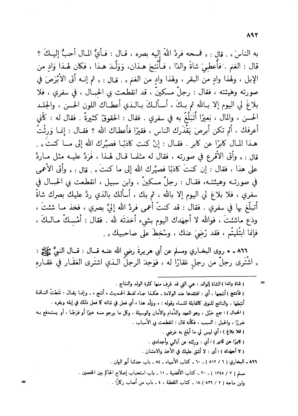 به الناس". قال: "فمسحه فرد الله إليه بصره، قال: فأي المال أحب إليك؟ قال: الغنم. فأعطي شاة والداً، فأنتج هذان، وولد هذا، فكان لهذا وادٍ من الإبل، ولهذا وادٍ من البقر، ولهذا وادٍ من الغنم". قال: "ثم إنه أتى الأبرص في صورته وهيئته، فقال: رجل مسكين، قد انقظعت بي الجبال، في سفري، فلا بلاغ لي اليوم إلا بالله ثم بك، أسألك بالذي أعطاك اللون الحسن، والجلد الحسن، والمال، بعيراً أتبلغ به في سفري. فقال: الحقوق كثيرة. فقال له: كأني أعرفك، ألم تكن أبرص يقذرك الناس، فقيراً فأعطاك الله؟ فقال: إنما ورثت هذا المال كابراً عن كابر. فقال: إن كنت كاذباً فصيرك الله إلى ما كنت". قال: "وأتى الأقرع في صورته، فقال له مثلما قال لهذا، فرد عليه مثل مارد على هذا، فقال: إن كنت كاذباً فصيرك الله إلى ما كنت". قال: "وأتى الأعمى في صورته وهيئته، فقال: رجلٌ مسكينٌ، وابن سبيل، انقطعت بي الحبال في سفري، فلا بلوغ لي اليوم إلا بالله، ثم بك، أسألك بالذي رد عليك بصرك شاة أتبلغ بها في سفري. فقال: قد كنت أعمى فرد الله إلى بصري، فخذ ما شئت، ودع ما شئت، فوالله لا أجهدك اليوم بشيء أخذته لله. فقال: أمسك مالك، فإنما ابتليتم، فقد رضي عنك، وسخط على صاحبيك".