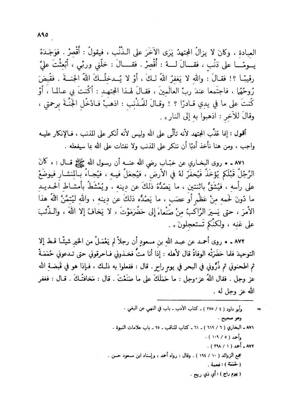 872 - * روى أحمد عن عبد الله بن مسعود أن رجلاً لم يعمل من الخير شيئاً قط إلا التوحيد فلما حضرته الوفاة قال لأهله: إذا أنا مت فخذوني فاحرقوني حتى تدعوني حممه ثم اطحنوني ثم ذروني في البحر في يوم راحٍ. قال: ففعلوا به ذلك، فإذا هو في قبضة الله عز وجل. فقال الله عز وجل: ما حملك على ما صنعت. قال: مخافتك. قال: فغفر الله عز وجل له.